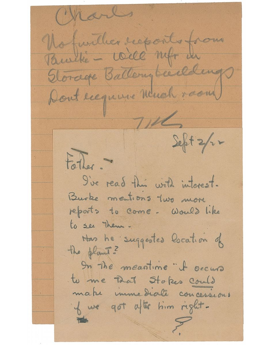 ANS, one page, lightly-lined, 5 x 7.5, circa September 1922. Brief note in response to his son. In full: “No further reports from Burke—will mfr in Storage Battery buildings. Don’t require much room.” His son’s initial letter, dated September 2, 1922, is stapled below, in part: “Burke mentions two more reports to come. Would like to see them. Has he suggested location of the plant?” Overall toning, otherwise fine condition. Accompanied by a seemingly unrelated sketch of a table leg, possibly in Edison’s hand. The “Burke” referenced may be James Burke, a member of the ‘Edison Pioneers,’ an organization composed of his oldest associates and employees.