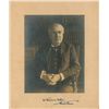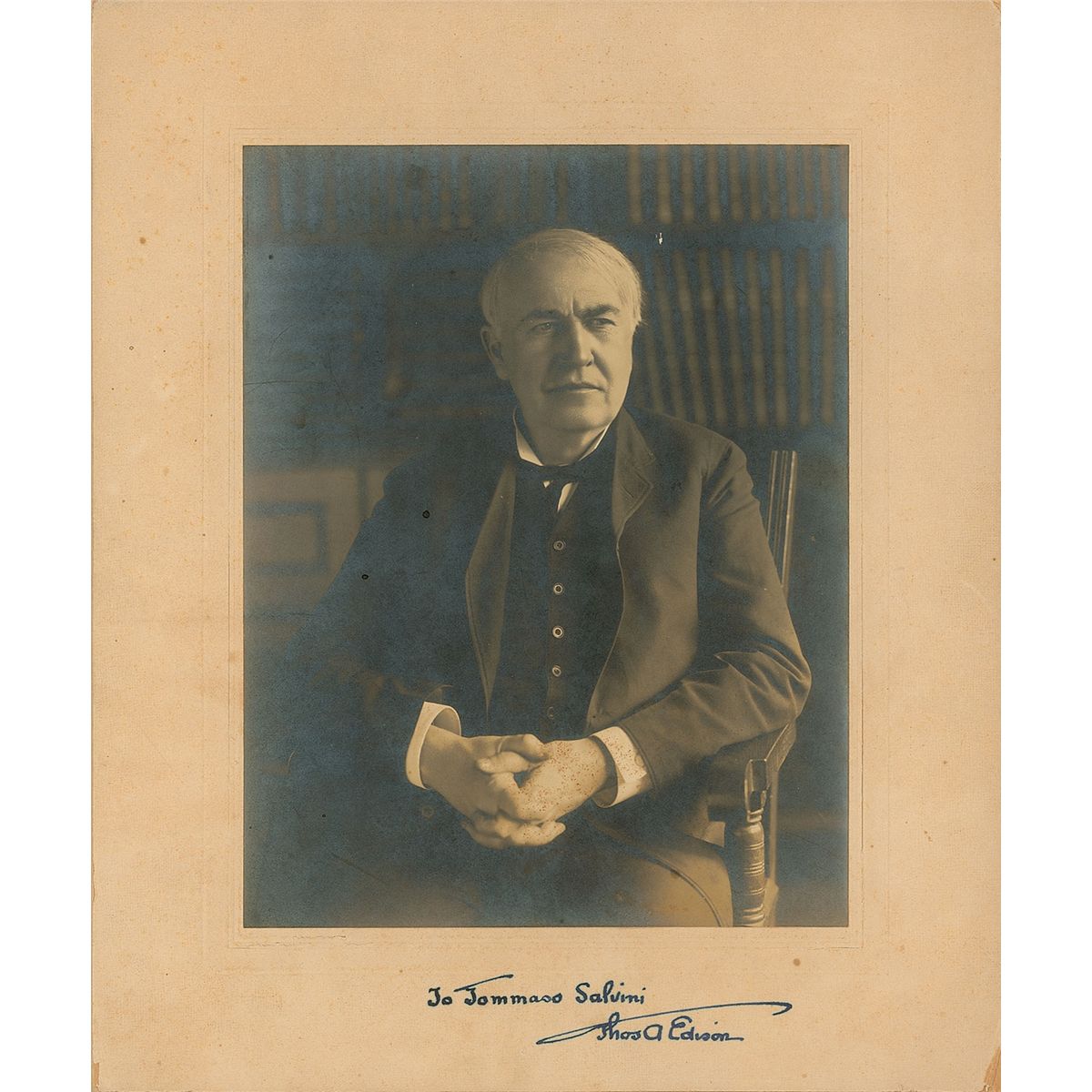 Matte-finish 6.5 x 8.5 photo of Edison seated in a library, affixed to its original 10 x 12 mount, signed and inscribed on the mount in blue ink, “To Tommaso Salini, Thos. A. Edison.” In very good condition, with light overall silvering to darker portions of image and background, light foxing to portion of image, lower corners of photo slightly separating from mount, some mild foxing to mount, and some light haloing to signature.
