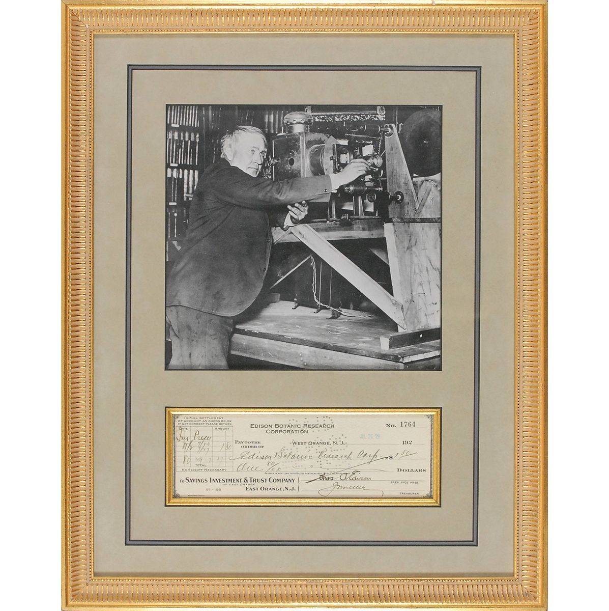 Edison Botanical Research Corporation business check, 8.5 x 2.75, filled out in another hand and signed by Edison with his instantly-recognizable ‘umbrella’ signature, “Thos. A. Edison,” payable to Edison Botanical Research Corp. for $1.80, stamp-dated July 31, 1929. Triple-suede-matted and framed with a photo of Edison and one of his inventions to an overall size of 15.25 x 19.5. In fine condition, with cancellation holes to body and above signature.