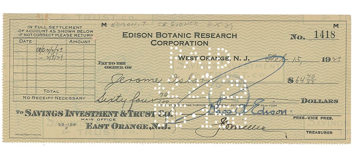 Edison Botanic Research Corporation business check, 8.25 x 3, filled out in another hand and signed by Edison with his prominent ‘umbrella’ signature, “Thos A. Edison,” payable to Jerome Osborn for $64.70, February 15, 1929. In fine condition, with expected bank stamps and cancellation holes (affecting the first portion of his signature).
