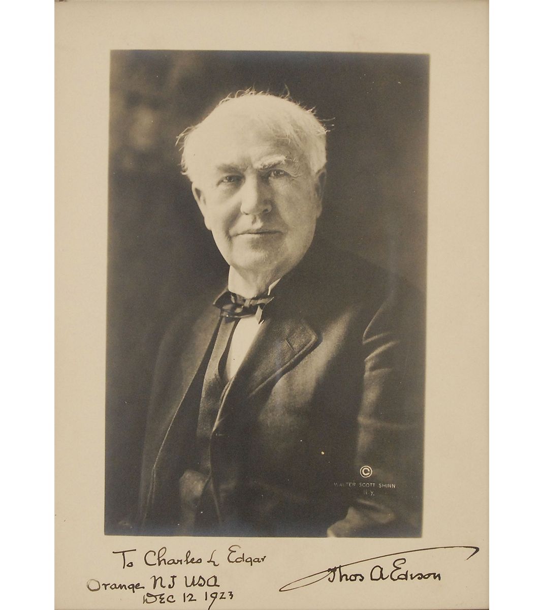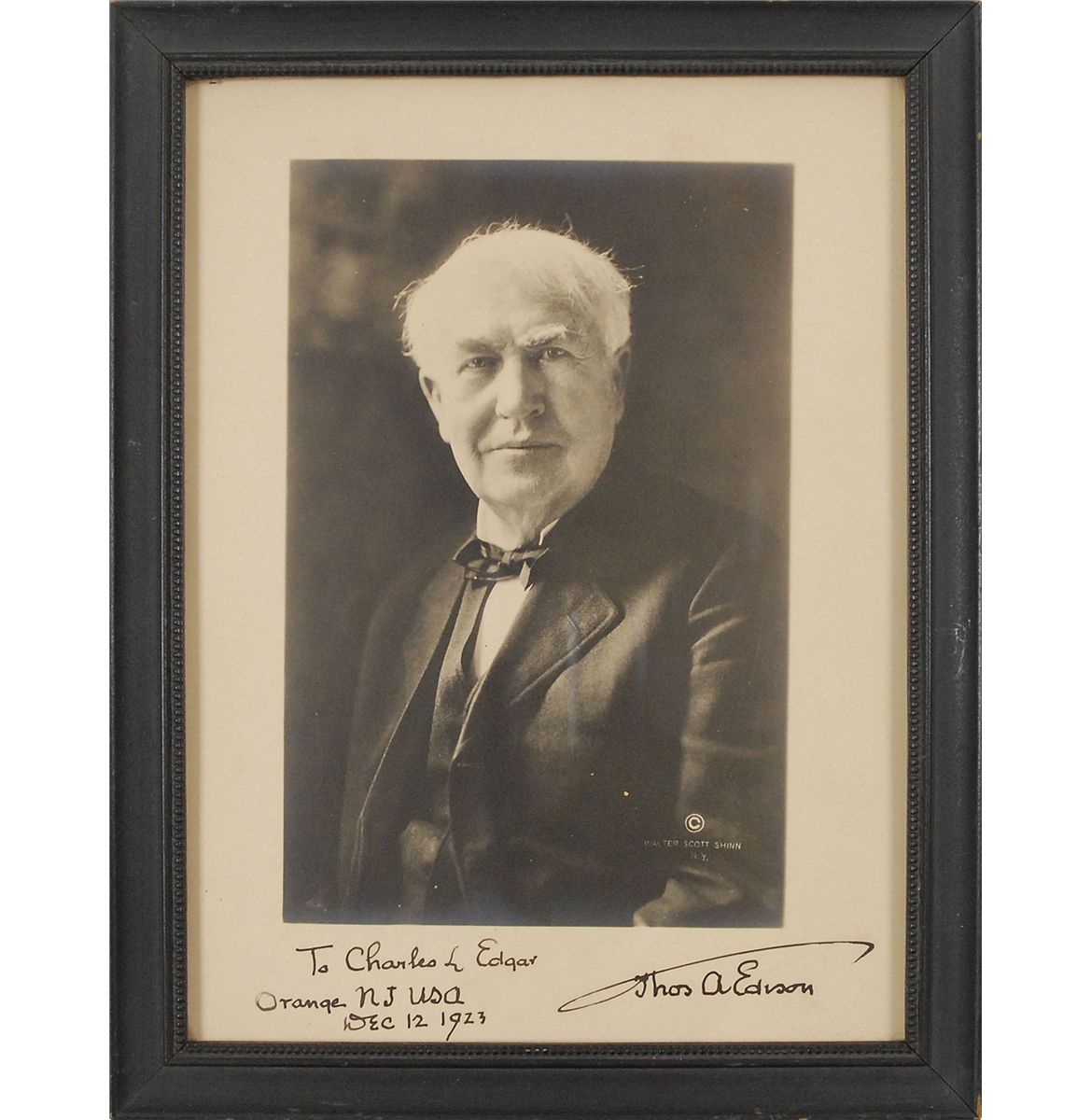Matte-finish 7.25 x 9.5 photo, signed and inscribed in black ink, “To Charles L. Edgar, Thos A. Edison, Orange NJ USA, Dec. 12, 1923.” Framed to an overall size of 8.75 x 11. In fine condition. In 1887, Edgar was hired by Boston Edison to be a station manager. He would go on to become one of the industry’s most important figures, serving as Boston Edison president for over 30 years.