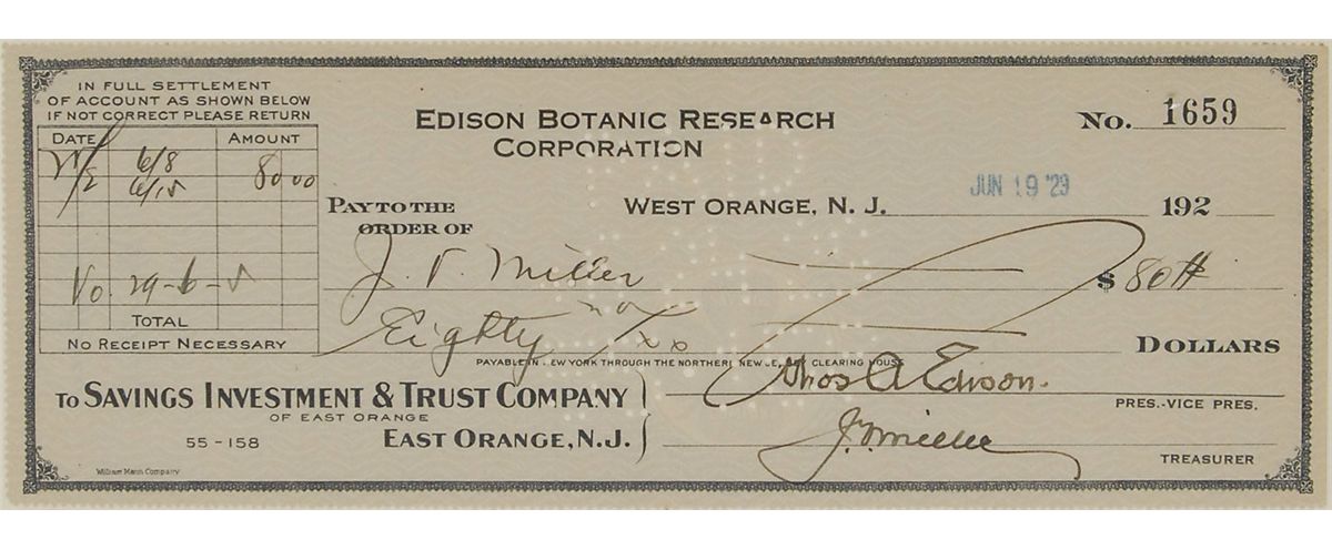 Edison Botanic Research Corporation business check, 8.5 x 3, filled out in another hand and signed by Edison with his prominent ‘umbrella’ signature, “Thos A. Edison,” payable to J. R. Miller for $80.00, stamp-dated June 19, 1926. Attractively cloth-matted and framed with a color portrait of Edison to an overall size of 15.25 x 22.25. In fine condition, with cancellation holes to center, lightly affecting first half of signature.
