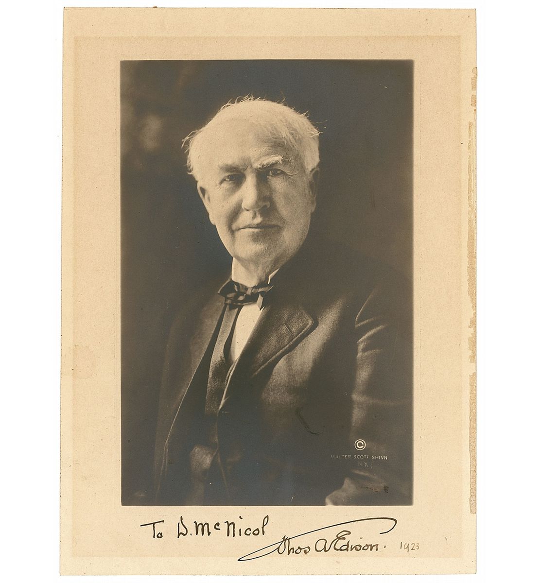 Iconic matte-finish 7.25 x 9.75 portrait of Edison by Walter Scott Shinn, boldly signed and inscribed in the lower border in fountain pen, “To D. McNicol, Thos. A. Edison,” with “1923” added in another hand. In fine condition, with a uniform block of light toning, slightly trimmed edges, and adhesive remnant to extreme right edge. A classic image of the distinguished American innovator.
