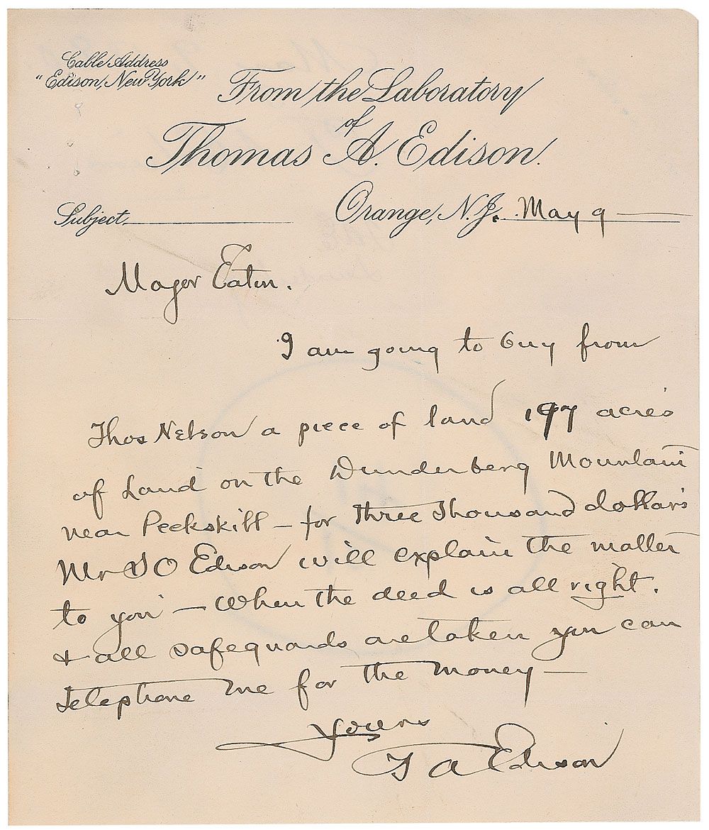 ALS signed “T. A. Edison,” one page, 5.5 x 6.5, The Laboratory of Thomas A. Edison letterhead, May 9, no year. Letter to Major Eaton. In full: “I am going to buy from Thos Nelson a piece of land 197 acres of Land on the Dunderberg Mountains near Peekskill—for three thousand dollar’s. Mr S O Edison will explain the matter to you—When the deed is all right & all safeguards are taken you can telephone me for the money.” Several dockets and notations in another hand are on the reverse. Intersecting folds, one in between initials, a diagonal crease to upper portion, staple holes to top left, and some scattered soiling, otherwise fine condition. In 1888, Edison had created a method for using electromagnets to separate and refine iron ore. Unfortunately, the iron ore produced was lower in quality than expected, the machinery broke down often, and the fine, crushed iron was difficult to work with. An exceptionally desirable early Edison letter.