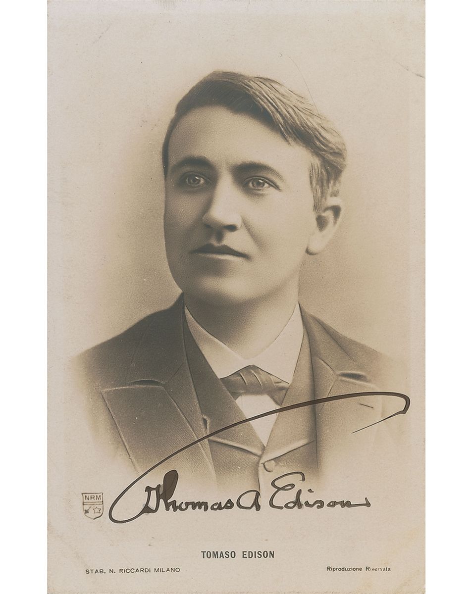 Fantastic matte-finish 3.5 x 5.5 postcard photo of Edison as a young man in the 1870s, beautifully signed in bold black ink with his famous ‘umbrella’ signature, “Thomas A. Edison.” In fine condition, with light marks to corner tips and slight spreading to ink in the first couple letters of his signature. An infrequently seen image of Edison at the beginning of his long and illustrious career.
