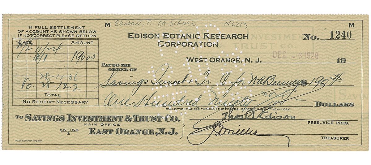 Edison Botanic Research business check, 8.25 x 3, filled out in another hand and signed by Edison, “Thos. A. Edison,” payable to Savings Invest & Tr. Co. for $190, stamp-dated December 6, 1928. In fine condition, with expected cancellation holes just above the signature.