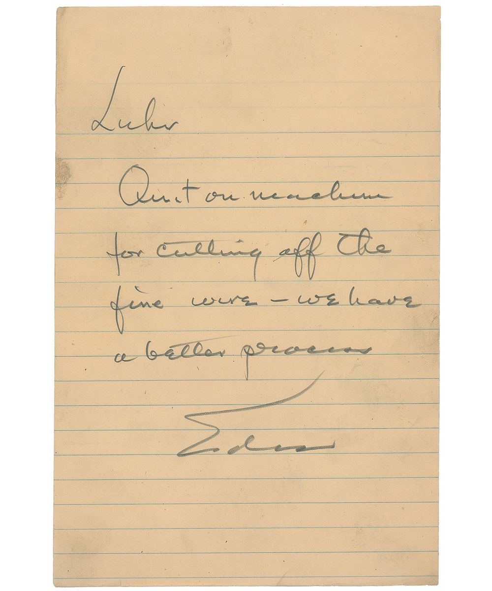 ANS in pencil, quickly signed “Edison,” one page, 6 x 9, no date but circa 1912. A note to Charles W. Luhr, the vice president and works manager for the Edison Phonograph Works in Orange, New Jersey. In full: “Luhr, Quit on machine for cutting off the fine wire—we have a better process.” In fine condition, with light toning and soiling, and a tiny tear to the top edge. Desirable content about the manufacturing process for one of Edison’s noteworthy inventions.