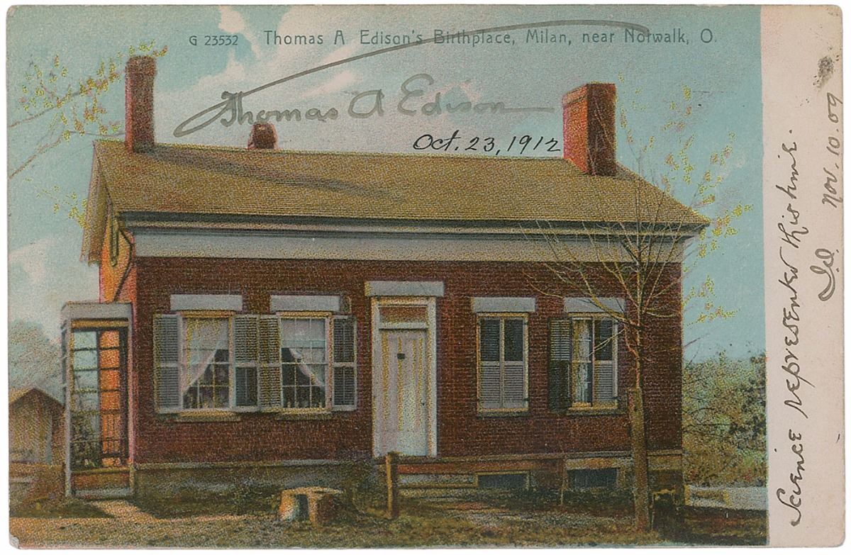 Color postcard depicting Edison’s birthplace in Milan, Ohio, 5.25 x 3.5, signed in fountain pen, “Thomas A Edison.” Collector’s notation below indicates that it was received on October 23, 1912. Some light wear to corners, slight soiling, and the signature a shade light, otherwise fine condition.