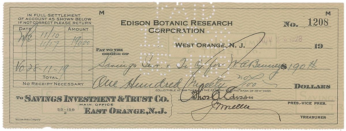 Edison Botanic Research Corporation business check, 8.25 x 3, filled out in another hand and signed by Edison, with his prominent ‘umbrella’ signature, “Thos A. Edison,” payable to Savings Investment & Trust Company for $190, stamp-dated November 22, 1928. In fine condition, with a central vertical bend, expected cancellation holes, a chip to bottom edge, and some trivial spreading to a few letters of the signature.