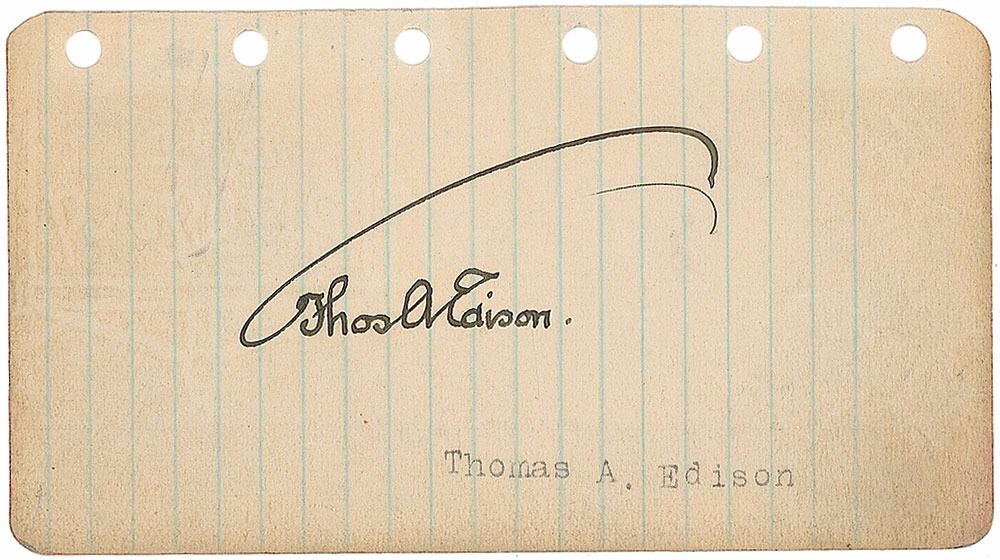 Bold ink ‘umbrella’ signature, “Thos. A. Edison,” on an off-white 4.5 x 2.5 lined page. In fine condition, with moderate toning and soiling to borders, a light paperclip impression to top edge, and a stray ink mark below the ‘umbrella.’