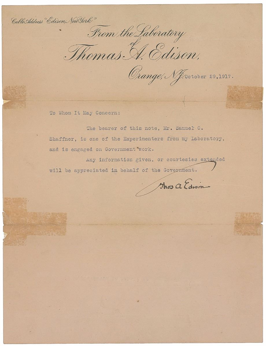 TLS signed “Thos. A Edison,” one page, 8.5 x 11, Laboratory of Thomas A. Edison letterhead, October 29, 1917. In full: “The bearer of this note, Mr. Samuel C. Shaffner, is one of the Experimenters from my Laboratory, and is engaged on Government work. Any information given, or courtesies extended will be appreciated in behalf of the Government.” In very good condition, with tape-repaired horizontal folds, small tears to edges, show-through from toned tape to reverse, and the top panel almost entirely detached.