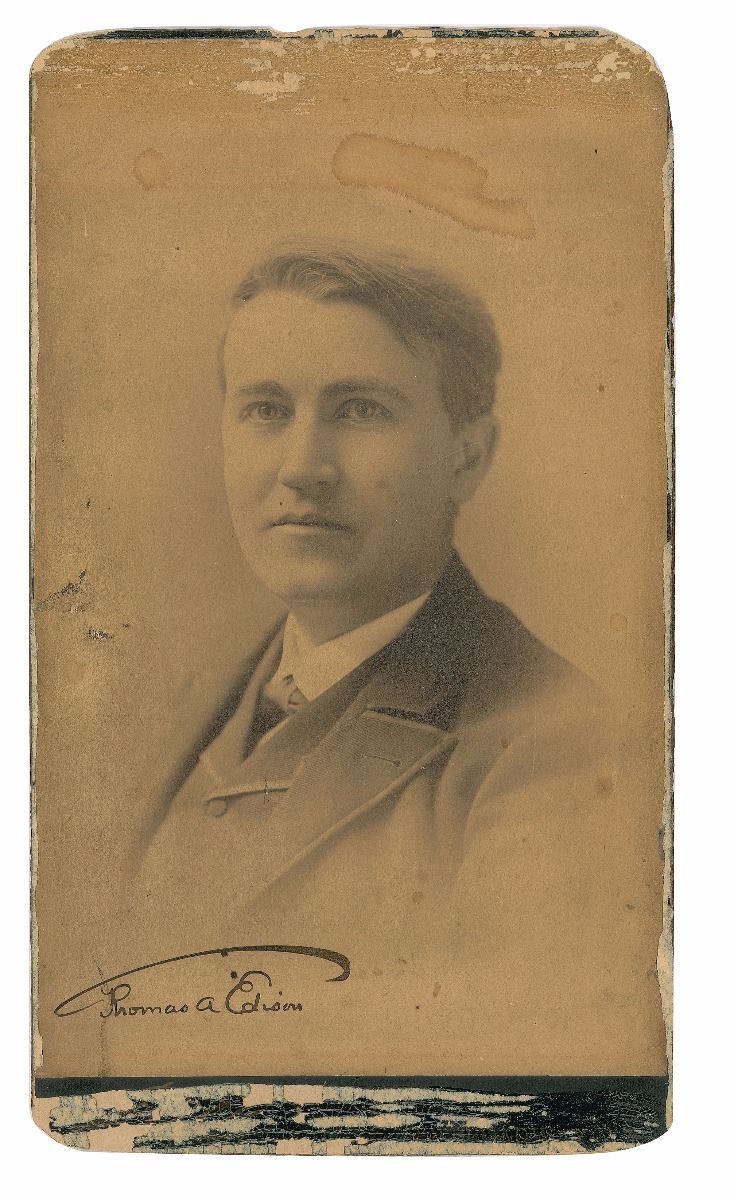 Early mounted 7.25 x 11.75 albumen portrait of Edison affixed to its original 7.5 x 12.75 mount, signed at the bottom of the image in black ink, “Thomas Edison.” In very good condition, with heavy chipping to mount edges, areas of dampstaining to image (not affecting the face or signature areas), and some surface loss to the upper portion of the photo. Oversized photos of Edison from this early period are not often encountered and this boasts a beautiful, bold example of his iconic ‘umbrella’ signature.