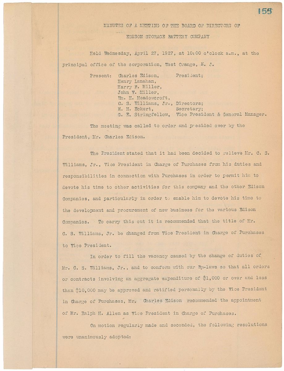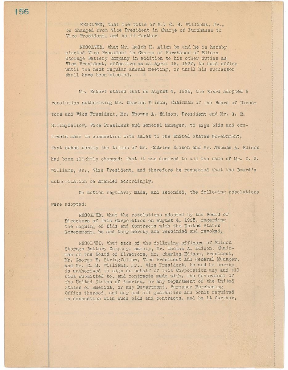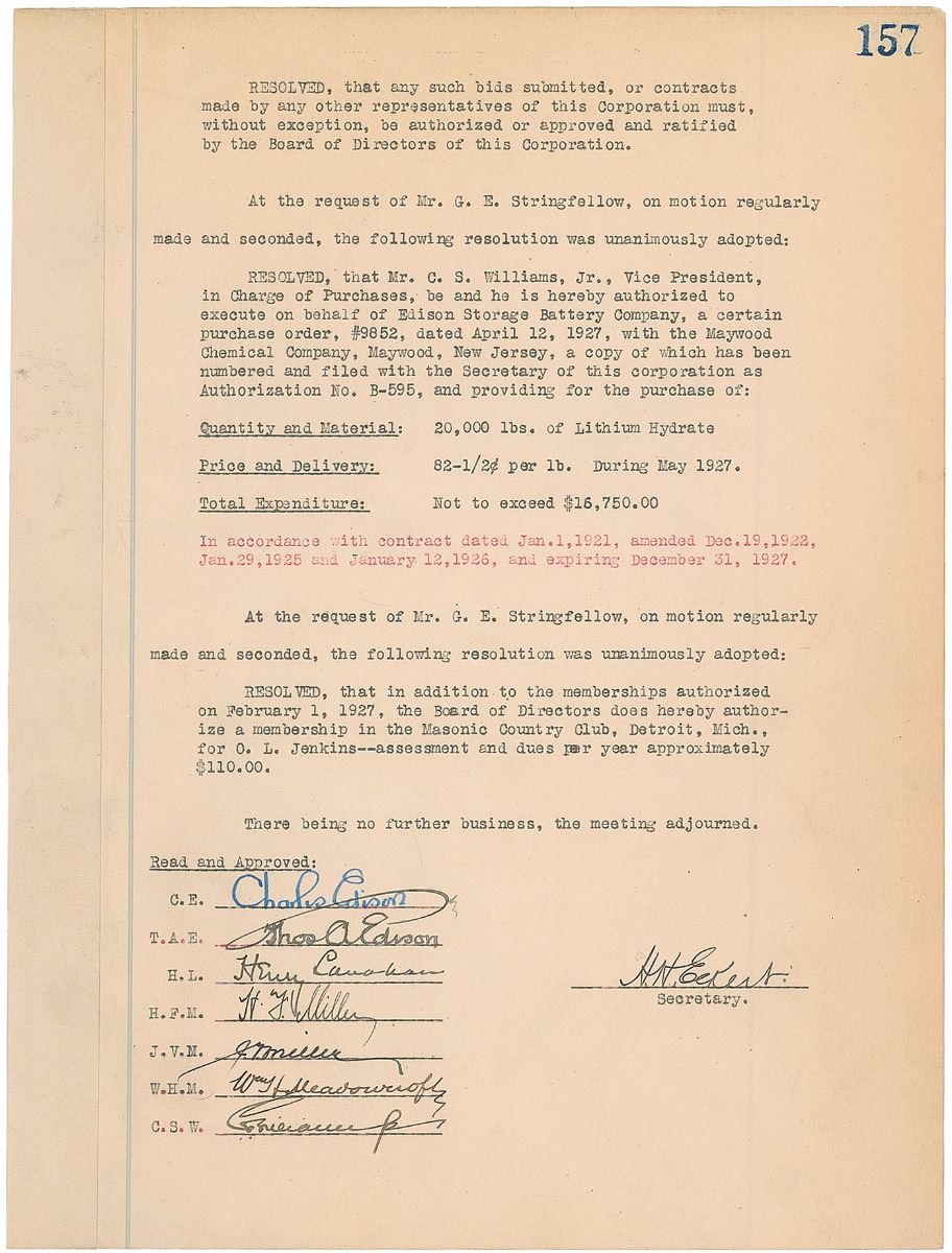 DS, signed “Thos. A. Edison,” three pages on two sheets, 8.5 x 11, April 27, 1927. Minutes of board meeting of the Edison Storage Battery Company. In part: “Resolved, that each of the following officers of Edison Storage Battery Company…is authorized to sign…all bids submitted to, and contracts made with, the Government of the United States of America, or any Department of the United States of America…At the request of Mr. G. E. Stringfellow…the following resolution was unanimously adopted…the Board of Directors does hereby authorize a membership in the Masonic Country Club, Detroit, Mich., for O. L. Jenkins.” Signed at the conclusion by Thomas Edison, his son Charles Edison, and the company’s other board members. In fine condition, with expected document wear and uniform toning.