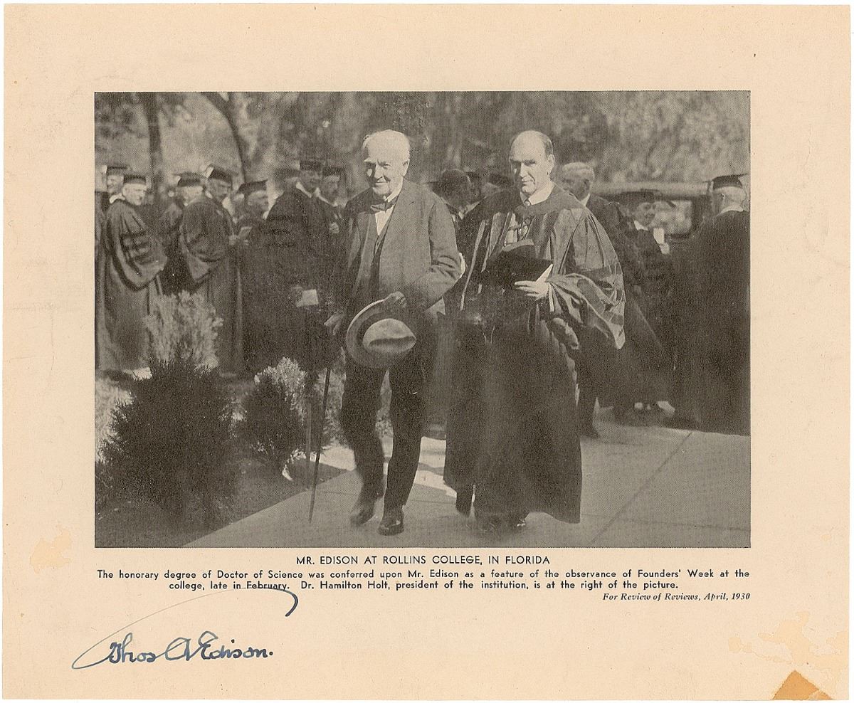 Desirable 8.75 x 7.25 paperstock photo of Edison walking with Hamilton Holt, the president of Rollins College, prior to Edison receiving an honorary degree of Doctor of Science from the institution on February 24, 1930, signed in the lower border with his prominent ‘umbrella’ signature in fountain pen, “Thos. A. Edison.” In fine condition, with unobtrusive creasing and surface loss to borders, and toning to lower right corner from a piece of tape to reverse.