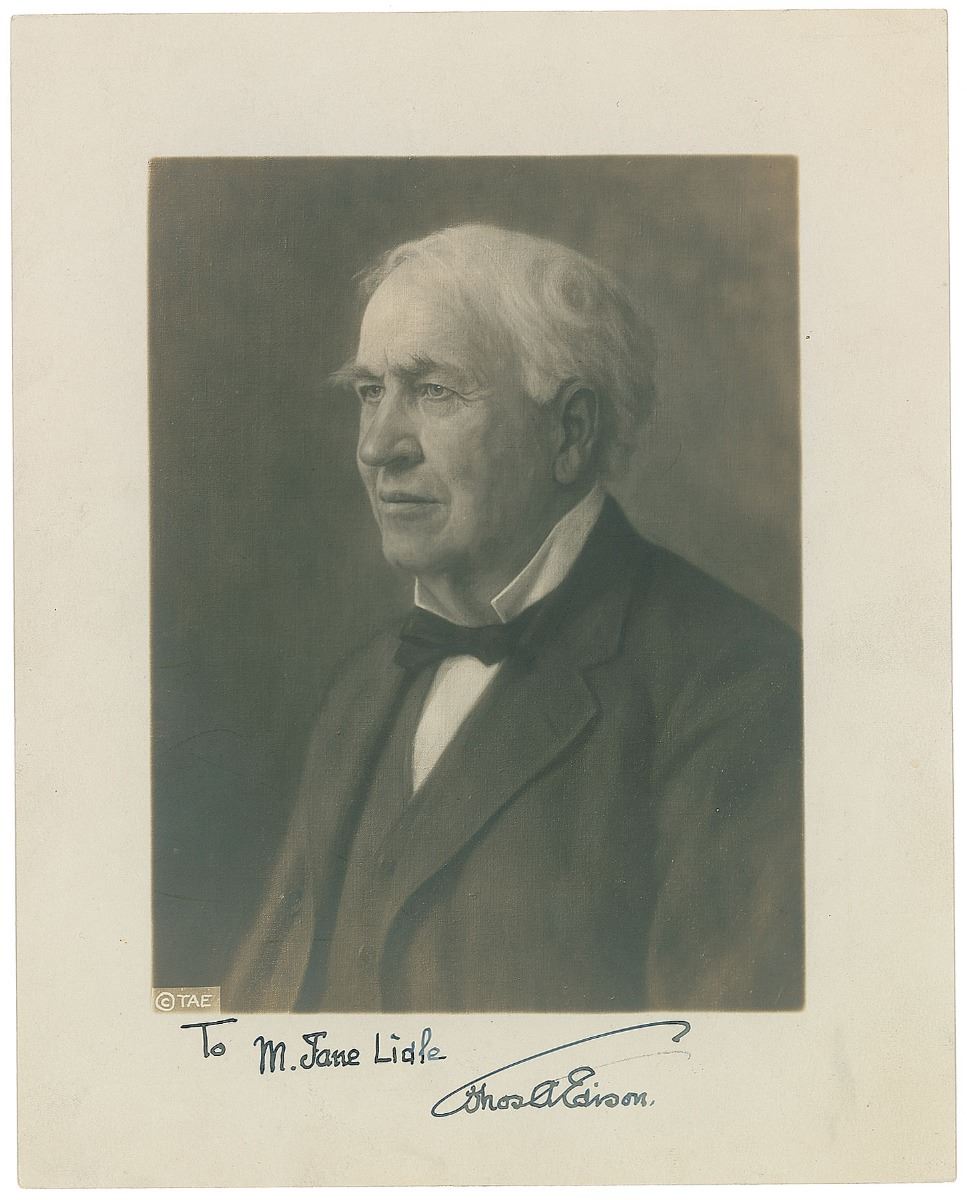Matte-finish 8 x 10 photo of an artist’s depiction of the revered inventor, signed and inscribed in the lower border in fountain pen, “To M. Jane Lidle, Thos A. Edison,” using his prominent ‘umbrella’ signature. Collector’s ink notations on reverse date the signature to September 29, 1927. In fine condition, with slight silvering to dark areas of the image. Consignor notes that the recipient was an employee of Edison’s in New Jersey.