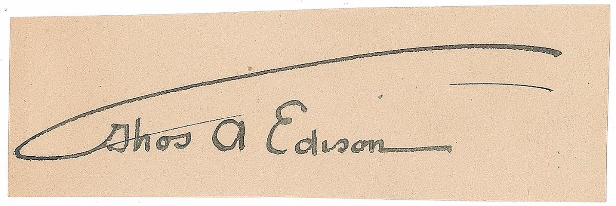 Ink ‘umbrella’ signature, “Thos. A. Edison,” on an off-white 4 x 1.25 clipped slip. In fine condition.