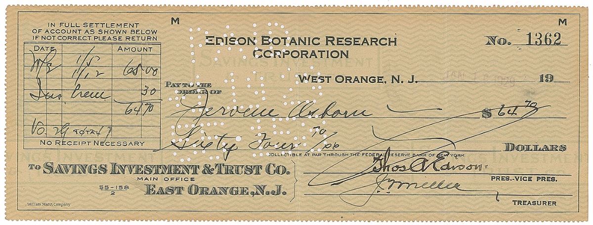 Edison Botanic Research Corporation business check, 8.25 x 3, filled out in another hand and signed by Edison, “Thos. A. Edison,” payable to Jerome Osborn for $64.70, stamp-dated January 16, 1929. In fine condition.