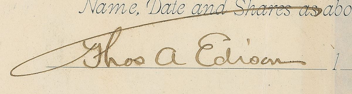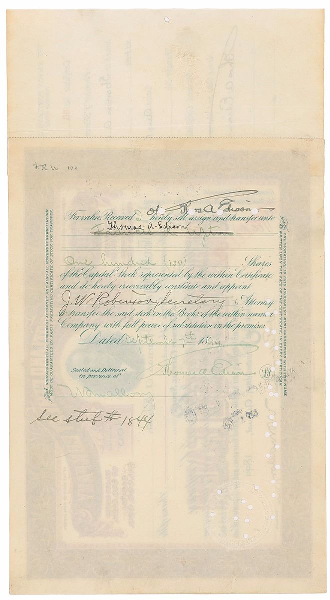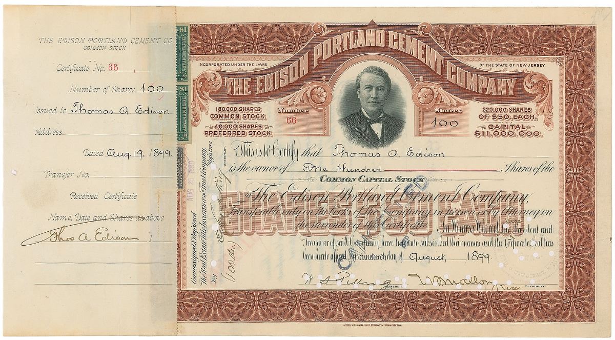 Partly-printed DS, signed “Thos. A. Edison,” one page, 15 x 8, August 19, 1899. Stock certificate issued to Edison for one hundred shares of capital stock in The Edison Portland Cement Company, featuring a fabulous engraved portrait of the inventor at the top, signed on the receipt affixed to the left edge by Edison in black ink, “Thos. A. Edison,” and signed twice on the reverse, once at the top in black to correct the misidentified stockholder, “of Thos. A. Edison,” and signed again at the conclusion in green to approve the transfer of the stock, “Thomas A. Edison.” Expected document wear, a vertical crease passing through a single letter of the signature on the receipt, and cancellation stamps and holes (holes affecting one signature on the reverse), otherwise fine condition.