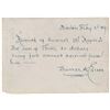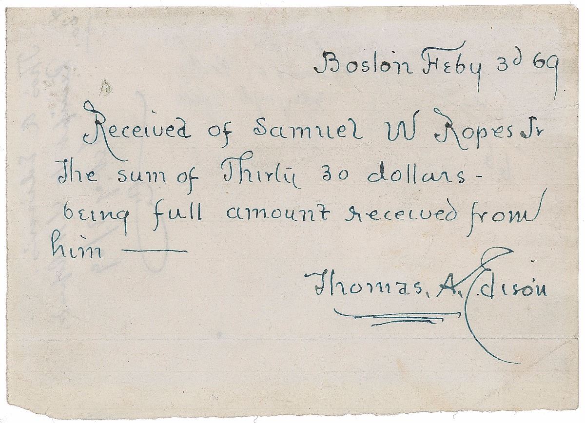 ADS, signed "Thomas A. Edison," one page, 5 x 3.5, Boston, February 3, 1869. Document related to his first successful invention, an improvement for telegraphs. In full: "Received of Samuel W. Ropes Jr the sum of Thirty 30 dollars-being full amount received from him." In fine condition, with mild soiling and expected document wear. Accompanied by copies of other documents associated with the transaction.