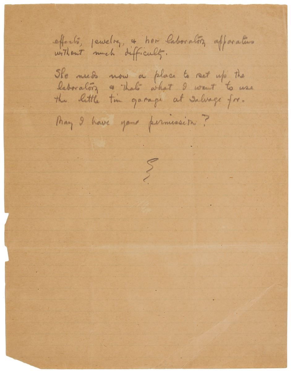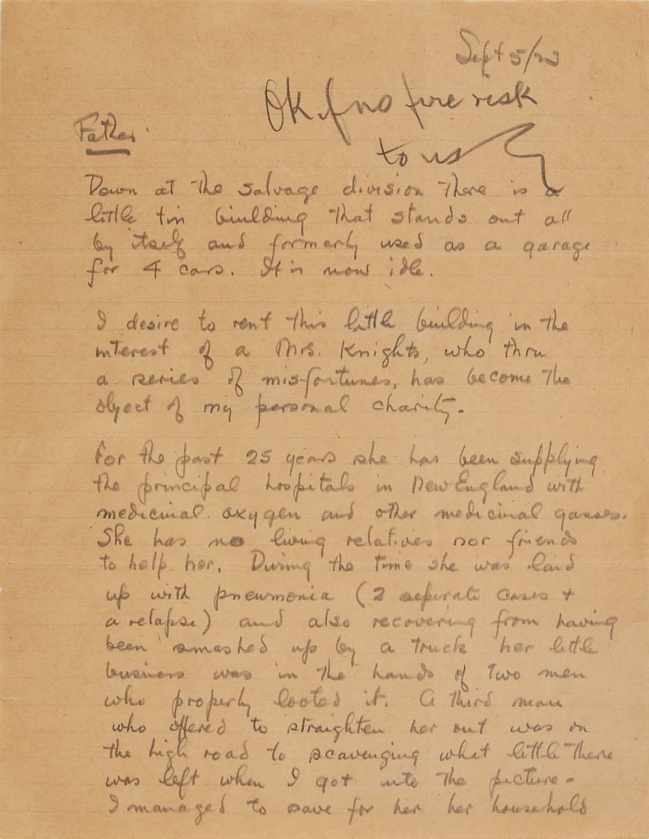 Letter to Thomas Edison from his son Charles, endorsed at the top by Thomas Edison in pencil, “OK if no fire risk to us, E,” one page both sides, 8.5 x 11, September 25, 1923. The ALS by Charles Edison, in part: "Down at the salvage division there is a little tin building that stands out all by itself and formerly used as a garage for 4 cars. It is now idle. I desire to rent this little building in the interest of a Mrs. Knight, who thru a series of misfortunes has become the object of my personal charity. For the past 25 years she has been supplying the principal hospitals in New England with medicinal oxygen and other medicinal gases…During the time she was laid up with pneumonia…and also recovering from having been smashed up by a truck her little business was in the hands of two men who properly looted it…She needs now a place to set up the laboratory & that's what I want to use the little tin garage at salvage for. May I have your permission?" In fine condition, with uniform toning. Pre-certified PSA/DNA.