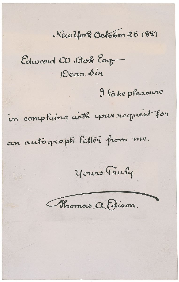 ALS signed with his prominent ‘umbrella’ signature, “Thomas A. Edison,” one page, 5 x 8, October 26, 1881. Letter to Edward W. Bok, in full: “I take pleasure in complying with your request for an autograph letter from me.” In fine condition, with trivial soiling and surface marks, and a crease to upper right corner. Bok was the editor of Ladies’ Home Journal from 1889 to 1919, building it into the world’s most widely circulated magazine. Pre-certified PSA/DNA.