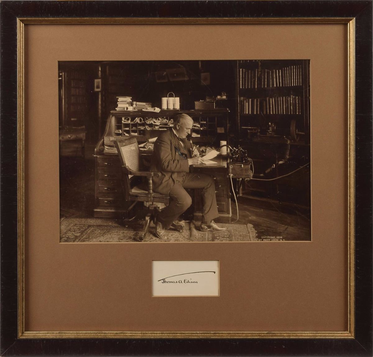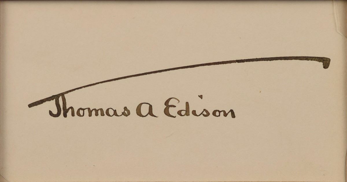 Exemplary ink 'umbrella' signature, "Thomas A. Edison,” on an off-white 3.25 x 1.75 card. Archivally matted and framed with a full-length Pach Bros. photo of Edison using his dictation machine to an overall size of 19 x 18. In fine condition. A classic signature.