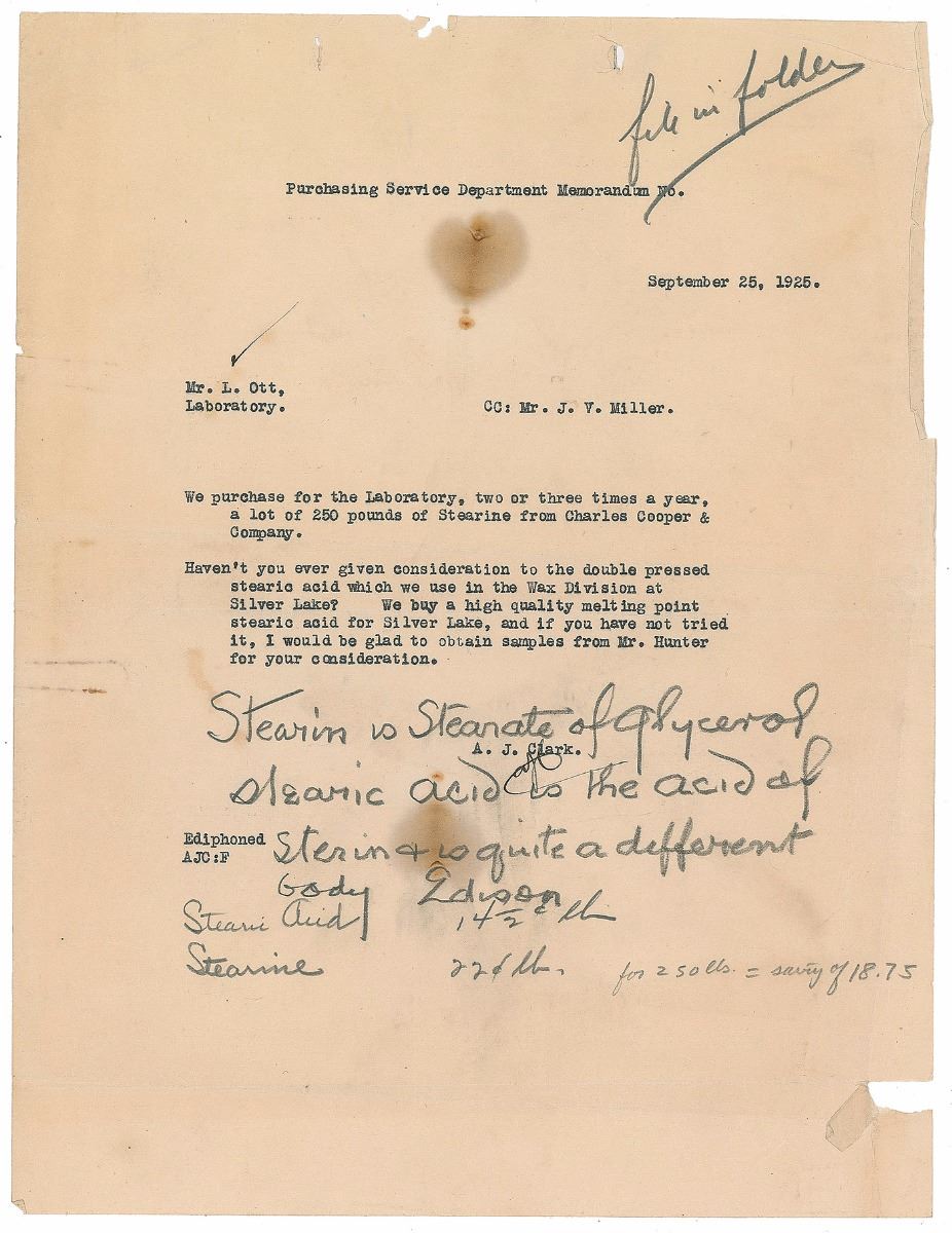 ANS in pencil, signed “Edison,” on an 8.5 x 11 memorandum sheet from the Purchasing Service Department concerning the possible replacement of acid types, dated September 25, 1925, in full: "Stearin is Stearate of glycerol, stearic acid is the acid of sterin & is quite a different body." In very good condition, with chipping and tears to the edges, paperclip impressions to the left edge, and two stains not affecting readability.