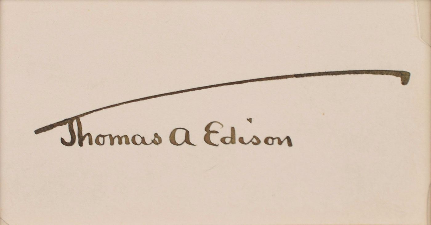Incredibly crisp fountain pen 'umbrella' signature, "Thomas A. Edison,” on a white 3.25 x 1.75 card. Archivally matted and framed with a vintage matte-finish Pach Bros. photo of Edison at his desk to an overall size of 19 x 18.25. In fine condition, with some scratches and a gouge to the photo that the signature is matted with. A wonderfully bold and clean signature elevated by its handsome display.