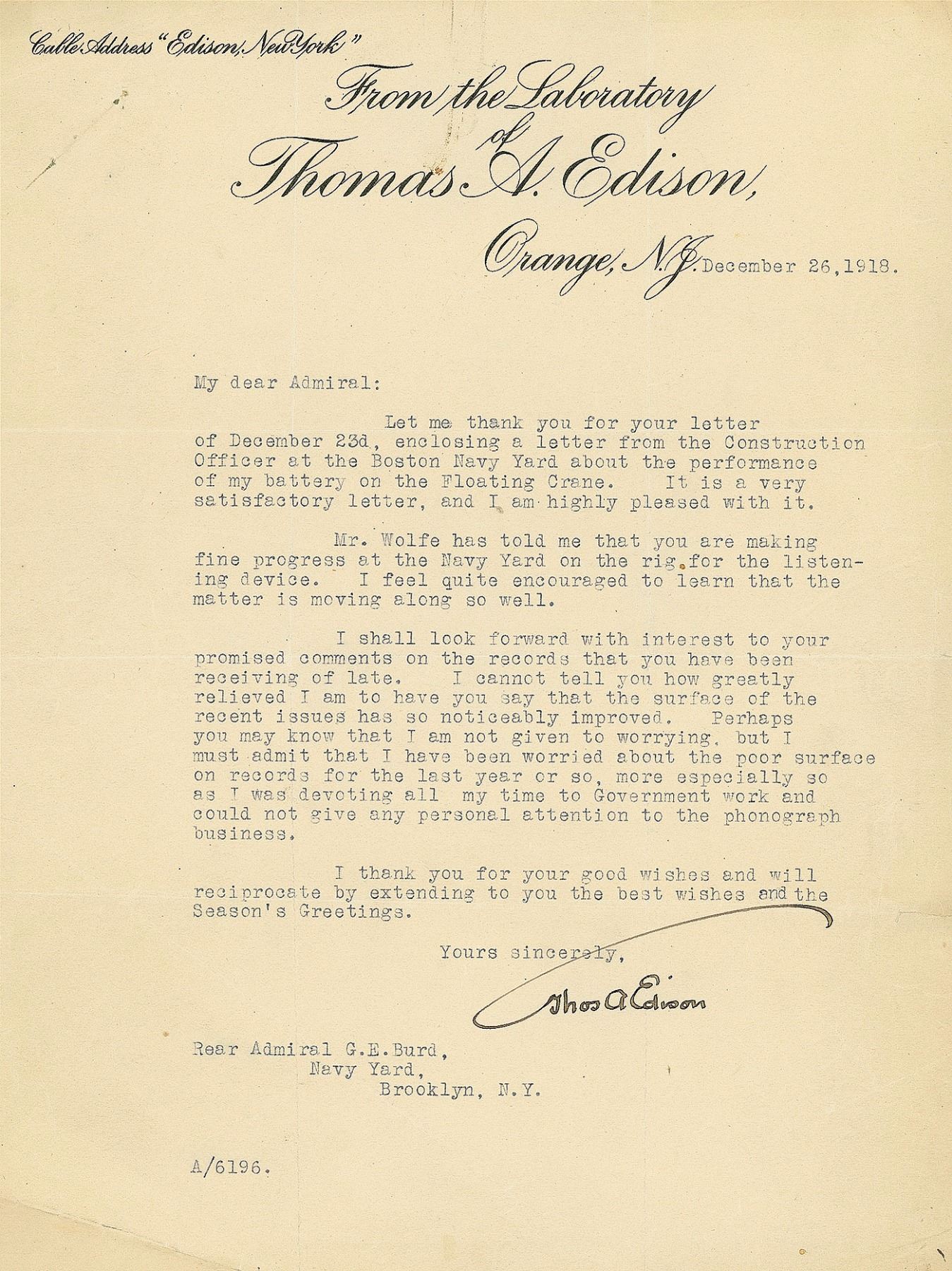 TLS signed “Thos. A. Edison,” one page, 8.25 x 11, From the Laboratory of Thomas A. Edison letterhead, December 26, 1918. Letter to Admiral G. E. Burd at the Brooklyn Navy Yard. In part: "Let me thank you for…enclosing a letter from the Construction Officer at the Boston Navy Yard about the performance of my battery on the Floating Crane. It is a very satisfactory letter, and I am highly pleased with it. Mr. Wolfe has told me that you are making fine progress at the Navy Yard on the rig for the listening device…I shall look forward with interest to your promised comments on the records that you have been receiving of late. I cannot tell you how greatly relieved I am to have you say that the surface of the recent issues has so noticeably improved. Perhaps you may know that I am not given to worrying, but I must admit that I have been worried about the poor surface on records for the last year or so, more especially so as I was devoting all my time to Government work and could not give any personal attention to the phonograph business." In very good to fine condition, with several intersecting folds, scattered light creasing, and old pin holes to the upper left corner. Accompanied by Burd's retained carbon copy of his letter to Edison. An interesting letter offering content related to Edison's many industries and inventions.