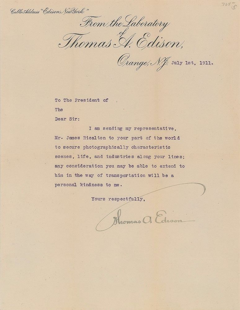 TLS signed “Thomas A. Edison,” one page, 8.5 x 11, From the Laboratory of Thomas A. Edison letterhead, July 1, 1911. Interesting form letter to the president of an unnamed nation, in full: "I am sending my representative, Mr. James Ricalton to your part of the world to secure photographically characteristic scenes, life, and industries along your lines; any consideration you may be able to extend to him in the way of transportation will be a personal kindness to me." Removably encapsulated in a mylar sleeve. In fine condition. Ricalton was a teacher, inventor, and photographer who circumnavigated the world seven times. His voyages first came to Edison's attention in the 1880s, and in 1888 he financed Ricalton's expedition to the Far East to search for a bamboo filament suitable for use in the incandescent lamp. In 1912, Edison dispatched Ricalton to Africa to test a motion picture camera—a trip that was presumably the subject of this letter. Interesting and unusual content in a letter boasting an ideal, complete example of Edison's iconic 'umbrella' signature.