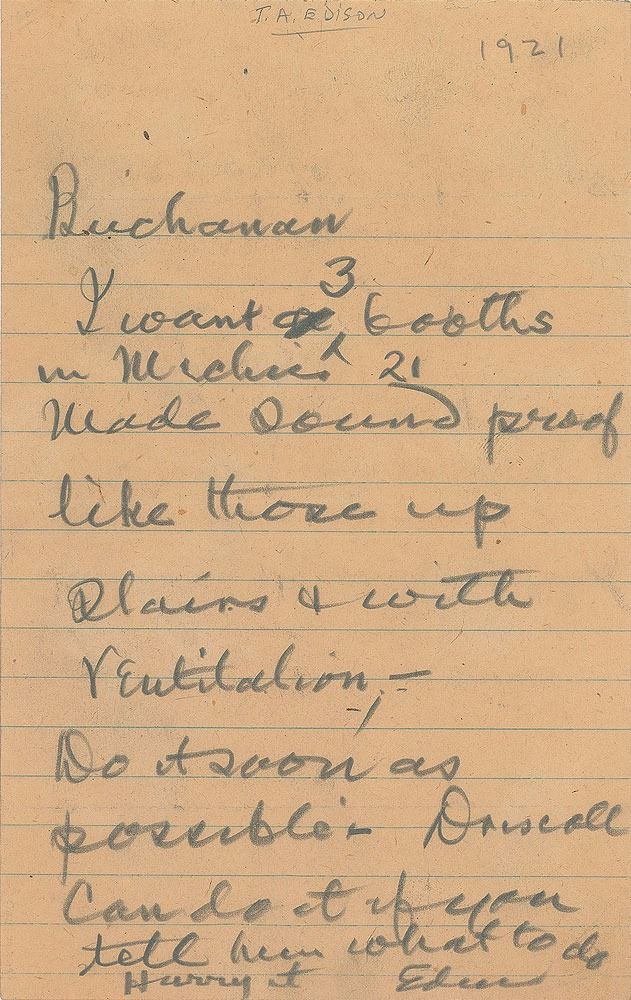 ANS in pencil, quickly signed “Edison,” one page, 5 x 8, 1921. Handwritten note to Jaffray P. Buchanan, who was employed as manager of the Edison Records Disc Division, in part: "I want 3 booths…made sound proof like those up stairs & with ventilation—do it soon as possible—Driscoll can do it if you tell him what to do. Hurry it." In fine condition.
