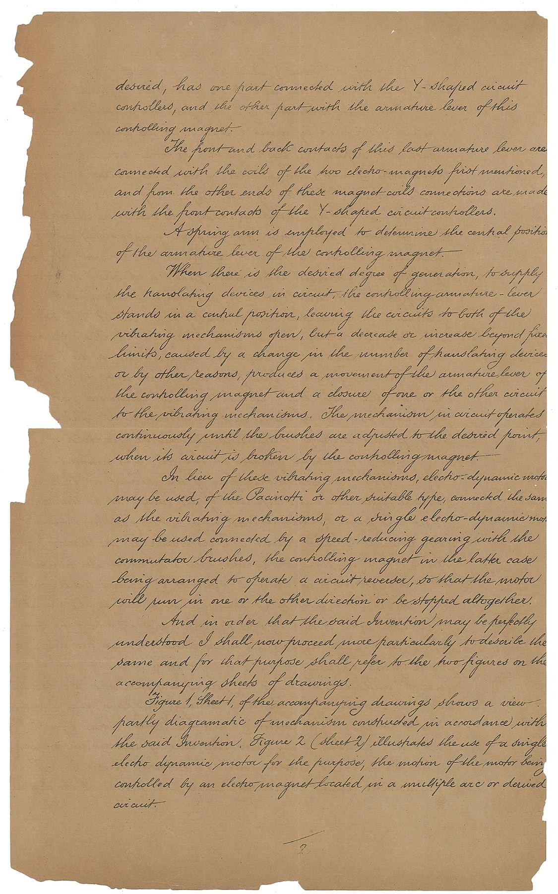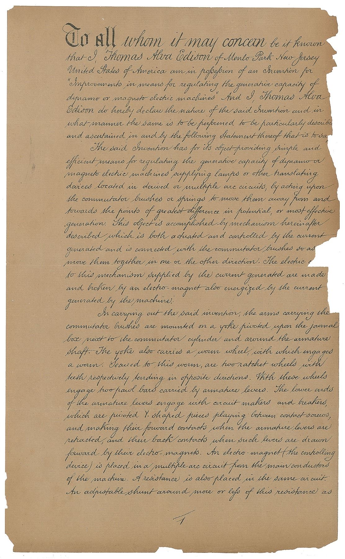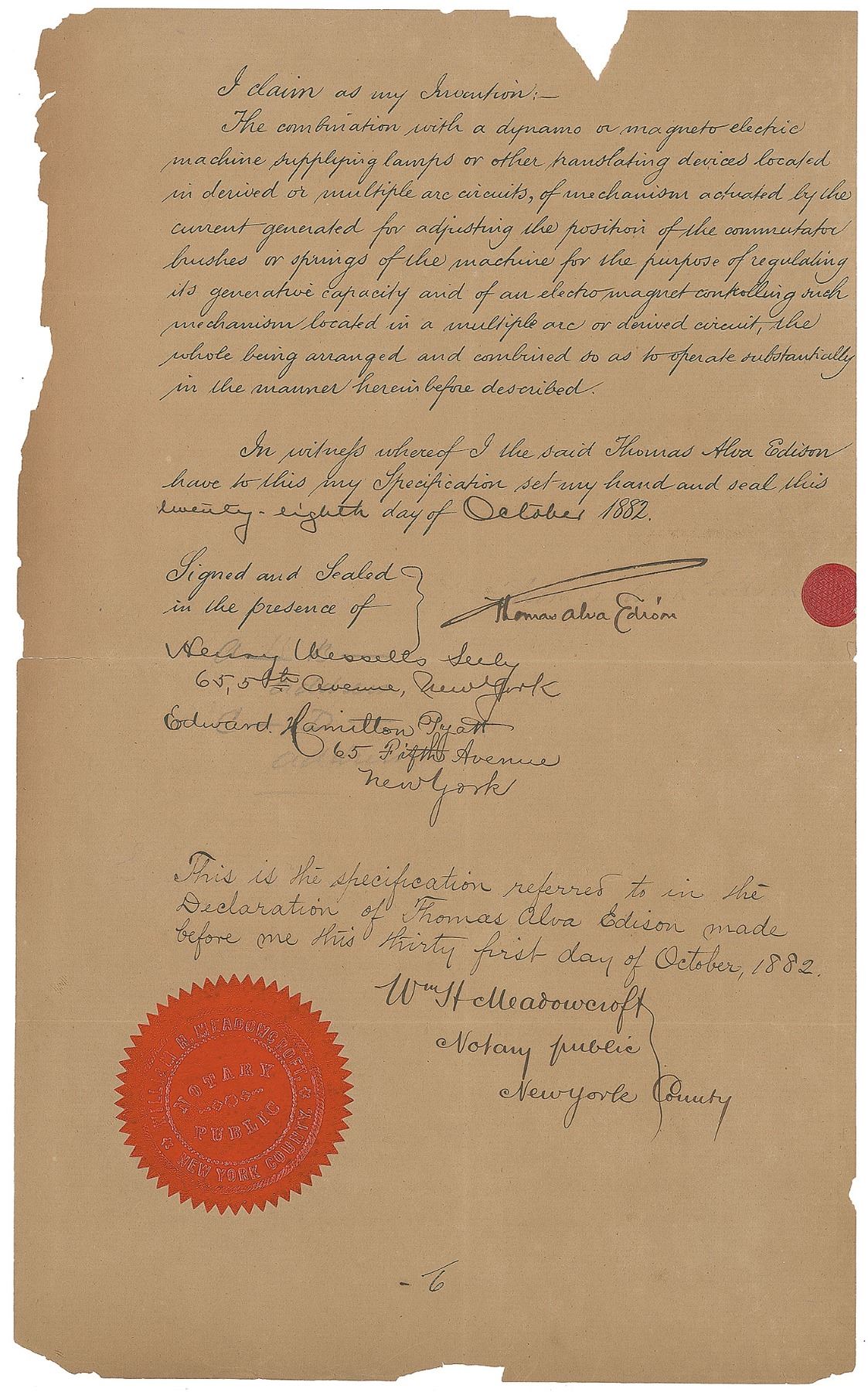 Tremendous partly printed DS, signed “Thomas Alva Edison,” six total pages, 7.75 x 12.75, October 28, 1882. A patent application for the “Improvements in means for regulating the generative capacity of dynamo or magneto electric machines,” which reads, in part: “The said Invention has for its object providing simple and efficient means for regulating the generative capacity of dynamo or magneto electric machines supplying lamps or other translating devices located in derived or multiple arc circuits, by acting upon the commutator brushes or springs to move them away from and towards the points of greatest difference in potential, or most effective generation. This object is accomplished by mechanism hereinafter described which is both actuated and controlled by the current generated and is connected with the commutator brushes so as [to] move them together in one or the other direction. The electric [current] to this mechanism supplied by the current generated are made and broken by an electro magnet also energized by the current generated by the machine.” Boldly signed at the conclusion by Edison with his trademark ‘umbrella’ signature, and countersigned by Henry Wessells Seely, Edward Hamilton Pyatt, and notarized by William Henry Meadowcroft. Orange New York County notary seal remains affixed to lower left corner. Also includes a pair of printed mechanical diagrams with a stapled partly printed document relating to the above patent, also dated October 28, 1882, and signed on behalf of Edison in a secretarial hand. In very good to fine condition, with splitting to intersecting folds, and some paper loss to the edges of the fragile sheets.