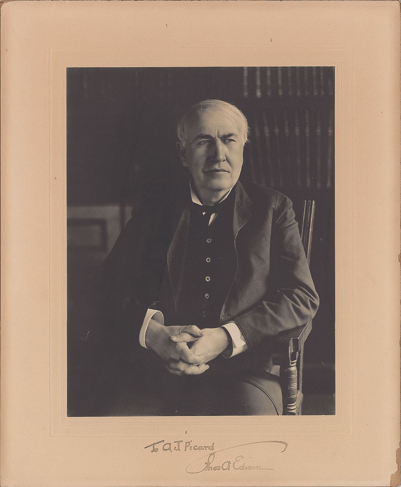 Wonderful matte-finish 6.5 x 8.5 seated portrait of the famed Menlo Park inventor, affixed to the original 9.75 x 12 mount, signed and inscribed on the mount in fountain pen, "To A. J. Picard, Thos. A. Edison." In very good to fine condition, with moderate overall silvering to the image, and some minor surface loss to the edges, easily matted out.