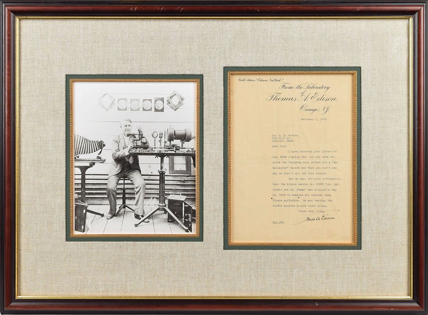 TLS signed “Thos. A. Edison,” one page, 7.5 x 10.5, From the Laboratory of Thomas A. Edison letterhead, February 1, 1923. Letter to W. H. Vernon, discussing the release of an Edison Disc Record. In full: "I have received your letter of Jan. 29th stating that you are sore because the Columbia have gotten out a 'Mr. Gallagher' record and that you don't see why we didn't get out this record. Let me say, for your information, that the Edison record No. 50970 'Mr. Gallagher and Mr. Shean' was shipped on May 15, 1922 to dealers who ordered them. 'Please apologize.' We are beating the needle machine people right along." Beautifully double-cloth matted and framed with a portrait to an overall size of 26.5 x 19.5. In very good to fine condition, with moderate overall creasing.