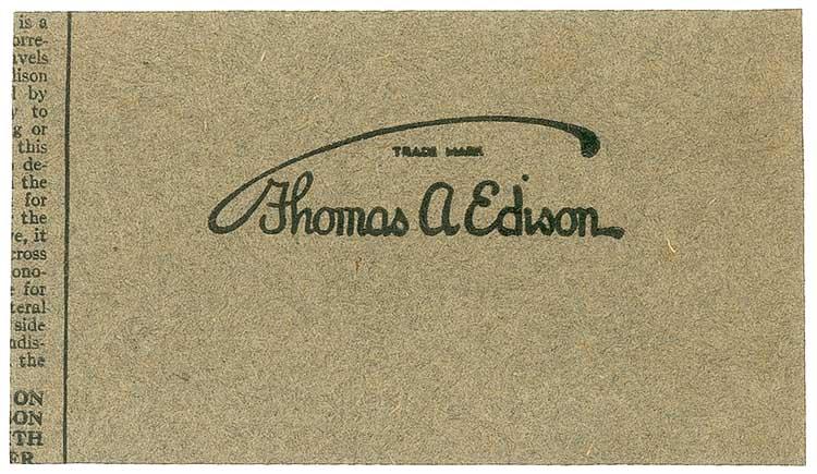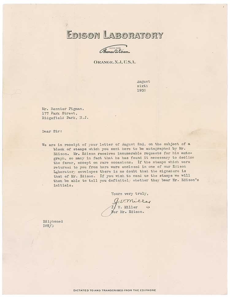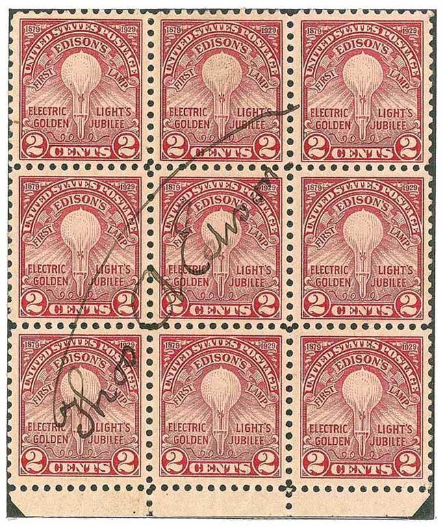 Block of nine, red 2-cent stamps commemorating “Edison’s First Lamp Electric Light’s Golden Jubilee,” 2.75 x 3.25, each featuring a light bulb in the center. Boldly signed across the sheet in black ink, with his recognizable ‘umbrella’ signature, “Thos. A. Edison.” Accompanied by a letter from Edison's secretary, dated 1930, assuring the owner of the stamp block that if the stamps were sent in an Edison Laboratory envelope, "there is not doubt that the signature is that of Mr. Edison." Also included is a partially printed card from Edison's office, declining a request to provide an autograph, due to "advanced age" and his desire "to conserve his strength for matters of utmost importance in connection with his business and experimental work." Also included are several vintage photos of the signed stamp block. In fine condition, with Edison’s middle initial over perforation. Pre-certified PSA/DNA and RRAuction COA.