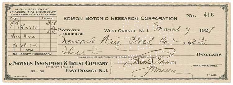 Edison Botonic Research Corporation business check, 8.5 x 3, filled out in another hand and signed by Edison, payable to Newark Wire Cloth Co. for $3.13, March 7, 1928. In very good condition, with three vertical creases, one through a single letter of signature, and cancellation holes covering signature. Pre-certified PSA/DNA and RRAuction COA.