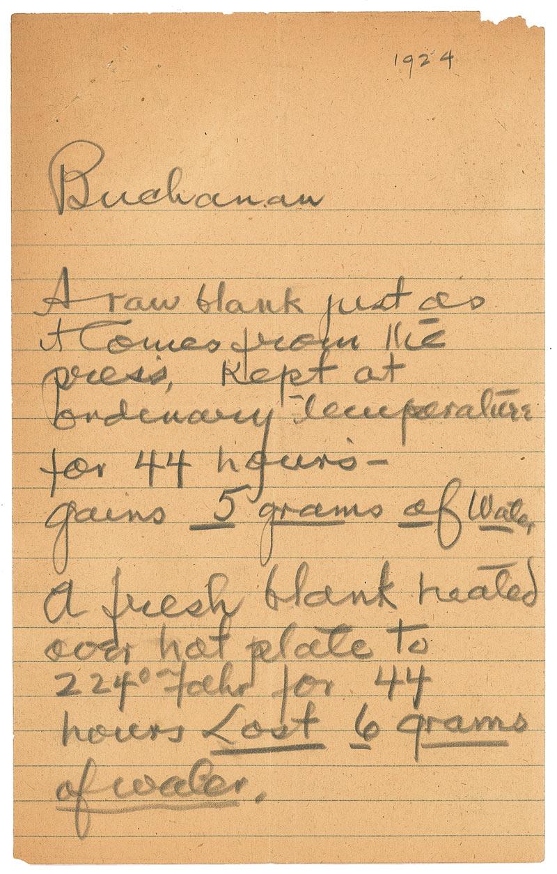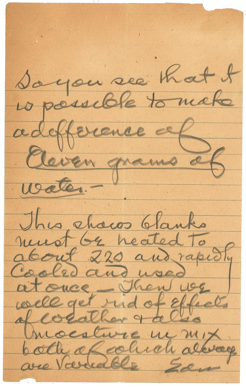 ALS, in pencil, signed “Edison,” two pages, lightly-lined, 5 x 8, no date. Edison writes to [Jaffrey P.] Buchanan, manager of his record disc division. In full: “A raw blank just as it comes from the press, kept at ordinary temperature for 44 hours – gains 5 grams of Water. A fresh blank heated over hot plate to 224° Fahr for 44 hours Lost 6 grams of water. So you see that it is possible to make a difference of Eleven grams of water. This shows blanks must be heated to about 220 and rapidly cooled and used at once – Then we will get rid of effects of weather & also moisture in mix both of which always are Variable.” By 1924, record sales, both cylinders and discs, had decreased with the advent of competition from radio. Operations were cut back, and Edison, now 77-years-old, began to experiment with long-playing records. The blanks Edison refers to in this letter are the blank phonograph records. These were introduced in October 1926 along with four new console disc phonographs. In very good condition, with uniform overall toning, chips to top edge, bisecting vertical fold, and staple holes to top left corners. Pre-certified PSA/DNA and RRAuction COA.