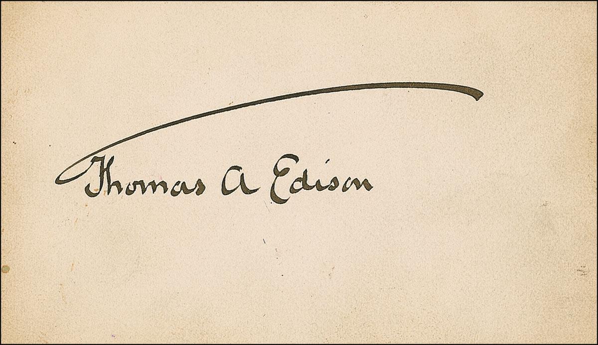 Bold vintage fountain pen ‘umbrella’ signature, “Thomas A. Edison,” on an off-white 3.75 x 2.25 card. In fine condition, with subtle soiling primarily to edges. Pre-certified PSA/DNA and RRAuction COA.