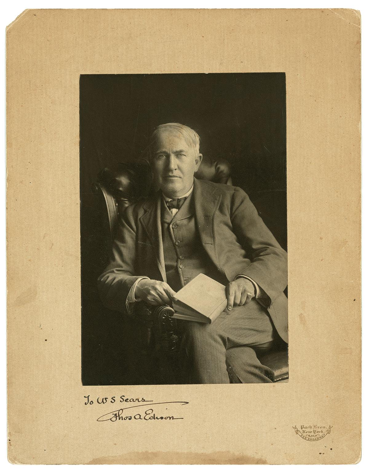 Outstanding vintage matte-finish 4.25 x 6.25 Pach Brothers photo of a seated Edison holding a book and gazing directly at the viewer, on a 7 x 9 mount. Signed and inscribed in black fountain pen “To W. S. Sears, Thos. A. Edison,” beneath his image on the mount with his “umbrella” signature. In very good condition, with light toning and soiling, minor staining to bottom edge of mount from exposure to moisture, chipped upper left corner (easily matted out), and crease to upper right corner tip. Pre-certified PSA/DNA and RRAuction COA.