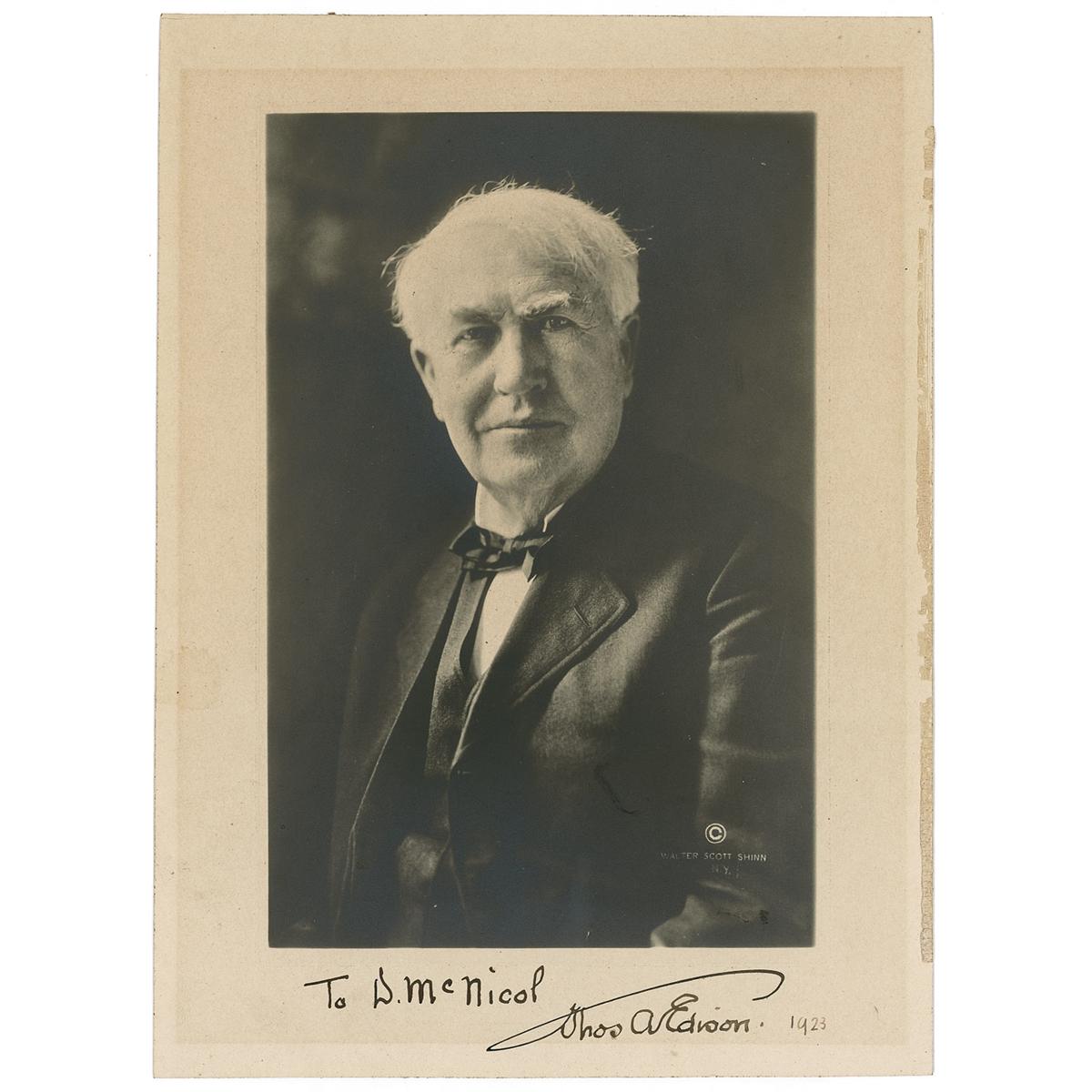 Vintage matte-finish 7.25 x 9.75 Walter Scott Shinn photo, signed and inscribed in the lower border in black ink “To D. McNicol, Thos A. Edison 1923.” Lightly trimmed left edge, some scattered light silvering to image, light border toning from previous display, and adhesive remnants along right edge, otherwise fine condition.