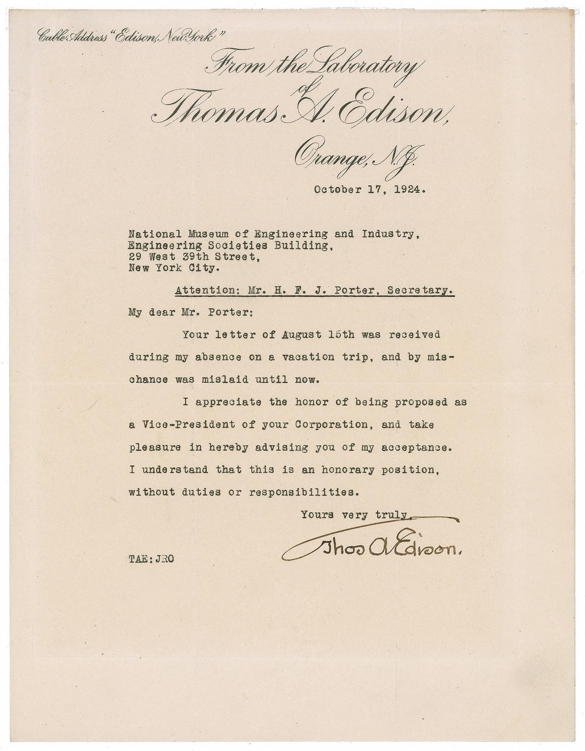 TLS signed “Thos. A. Edison,” one page, 8.5 x 11, Thomas A. Edison Laboratory letterhead, October 17, 1924. Letter to the secretary of the National Museum of Engineering and Industry H. F. J. Porter, accepting an appointment. In full, “Your letter of August 15th was received during my absence on a vacation trip, and by mischance was mislaid until now. I appreciate the honor of being proposed as Vice-President of your Corporation, and take pleasure in hereby advising you of my acceptance. I understand that this is an honorary position, without duties or responsibilities.” Nicely signed at the conclusion with Edison’s “umbrella” signature. In fine condition, with staple holes at top edge, intersecting mailing folds, one through a single letter of signature, and tape mounting remnants along top edge of reverse. Porter and his partner Carl Mitman attempted to establish a National Museum of Engineering and Industry as part of the Smithsonian Institute. Porter envisioned a shining monument to the American engineer. Besides Edison, Orville Wright, and Eli Whitney were also contacted regarding appointments.