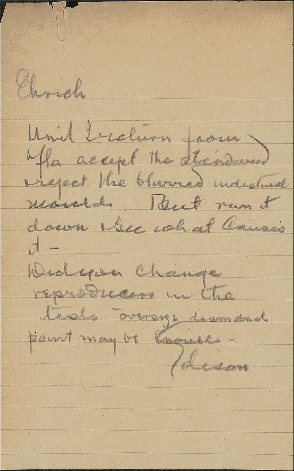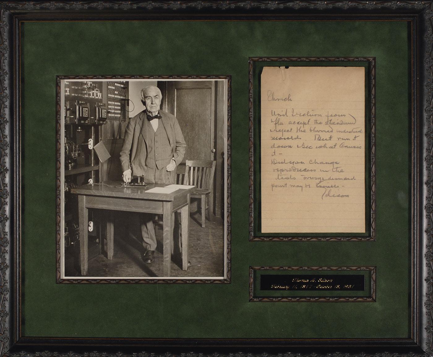 ANS signed “Edison,” one page, lightly-lined, 5 x 8, no date. A memo to one of his employees named Ehrich. In full: “Until I return from Fla. accept the standard & reject the blurred industrial mold. But run it down & see what causes it—Did you change the reproducers in the tests—oversize diamond point may be trouble.” Suede matted and framed with an original unsigned glossy 8 x 10 photo of Edison and a small name plaque, to an overall size of 20.5 x 17. In very good condition, with even overall toning, chips to top edge, first letter of Edison’s signature overlapping a word of text, as well as a paperclip impression. A fine example with underlying association to one of his greatest inventions, the phonograph.