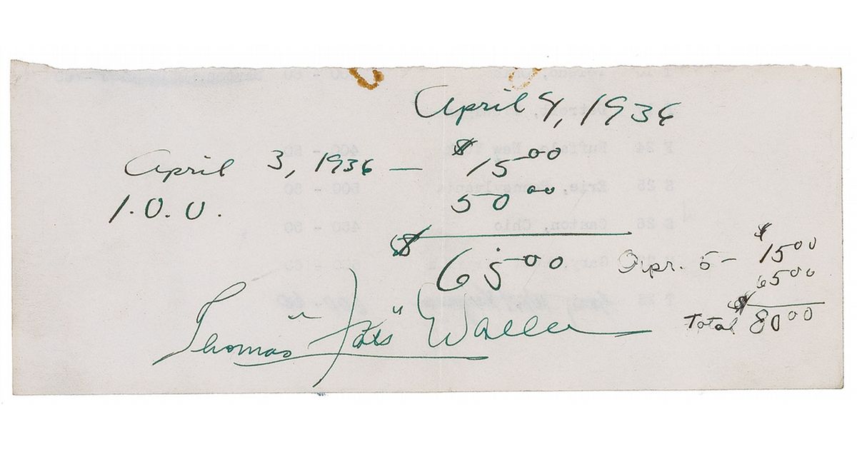 Handwritten receipt on an off-white 7.25 x 3 clipped slip. Waller acknowledges a few advances on his salary, signed in green ink, in full, “Thomas ‘Fats’ Waller.” In very good condition, with a central vertical fold passing through a single letter of the signature, two rusty paperclip impressions to the top, and a few paperclip impressions to the bottom edge.