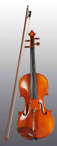 Description Needs re-assembly but in overall good shape. Bow has some gut loss. ADDITION: Inside label reads: “Designed tome of ‘’Wilheimj’’ Stradivarius of 1925. Thomas L. Falwick. Cleveland Ohio. M-II #353 1956." Violin is 23”L which has been suggested is a child’s size. The body is 13-5/8”L or 330mm suggesting a 3/4violin. Condition (Very Good). Size 22" L.