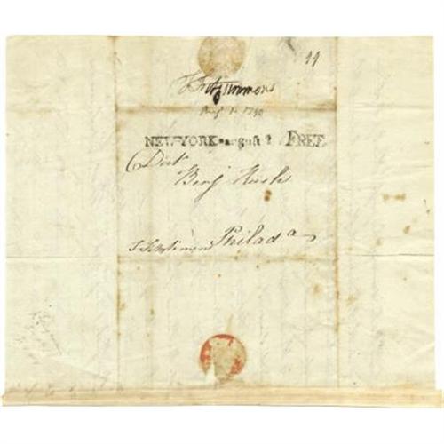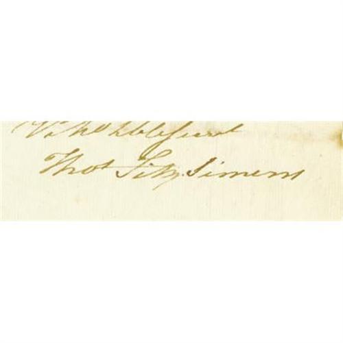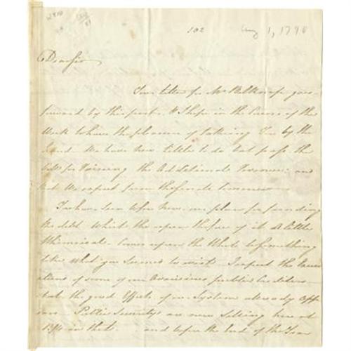 <B>Thomas Fitzsimons Autograph Letter Signed, "</B></I><I>Thos FitzSimons".</B></I> Three pages 7.75" x 8. 9", New York, August 1, 1790, to Dr. Benjamin Rush in which the Pennsylvania Congressman commends the recently-passed Assumption Act in which the federal government assumed the debts of the several states. Passage of this act was part of a significant compromise between Alexander Hamilton and Thomas Jefferson. Hamilton wanted the federal government to assume all debts incurred by the states during the Revolutionary War. However, as most of the debt was held by northern states, southerners bristled at the imposition. To quell this southern unease, a compromise was made to locate the federal capital in the south. Due to this compromise, Hamilton was able to secure key southern votes to enable the passage of the Assumption Act. Fitzsimmons writes, in part: "<I>You have seen before now-our plan for funding the debt, which the upon the face of it a little Whimsical - Comes upon the whole to something like what you seemed to wish - I expect the execrations of some of our Avaricious public Creditors - but, the good Effects of our System already appears - Public Securitys </B></I> <I>sic</B></I> <I> are now Selling here at 13/4 in the L - and before the End of the Year I have no doubt it will be at 16/6 while Real Estates will increase in the same proportion the whole sum to be raised annually is less than 3.400.000 dollars-which...will be done by adding a few pence 1b to tea- & something more to Spirits & Wine - Not a shilling on lands or Houses- on the Contrary we have rendered it unnecessary for the States to lay any such taxes, as we have taken the burthen of debt off their shoulders...Add to this the benefits that will accrue from the Residence of Congress- & the Negotiations of all the Revenue - & You must admit that our time here however uselessly spent as to ourselves has not been so as it respects our State </B></I> Pennsylvania <I>- if this will not cover a multitude of our Political Sins - I wonder at it...</B></I>" Fitzsimons (1741-1811) served as president of Philadelphia's Chamber of Commerce, trustee of the University of Pennsylvania, and a founder and director of the Bank of North America. Mounting strip along left margin wit a few minor chips, light folds, else fine. This piece contains rather important historical content dating to our early Founders. <I>Ex. Henry E. Luhrs Collection.</B></I><BR><BR><b>Shipping:</b> Flat Material, Small (<a target="_blank" href="http://www.heritageauctions.com/common/shipping.php">view shipping information</a>)