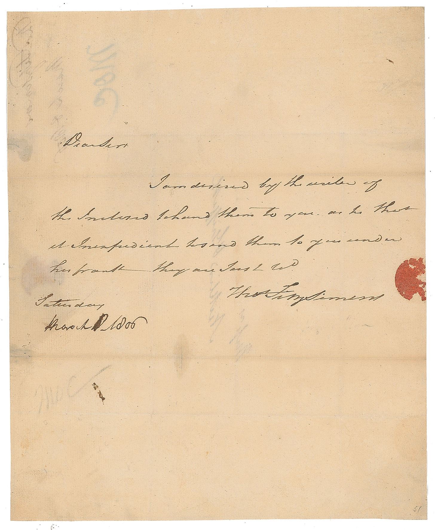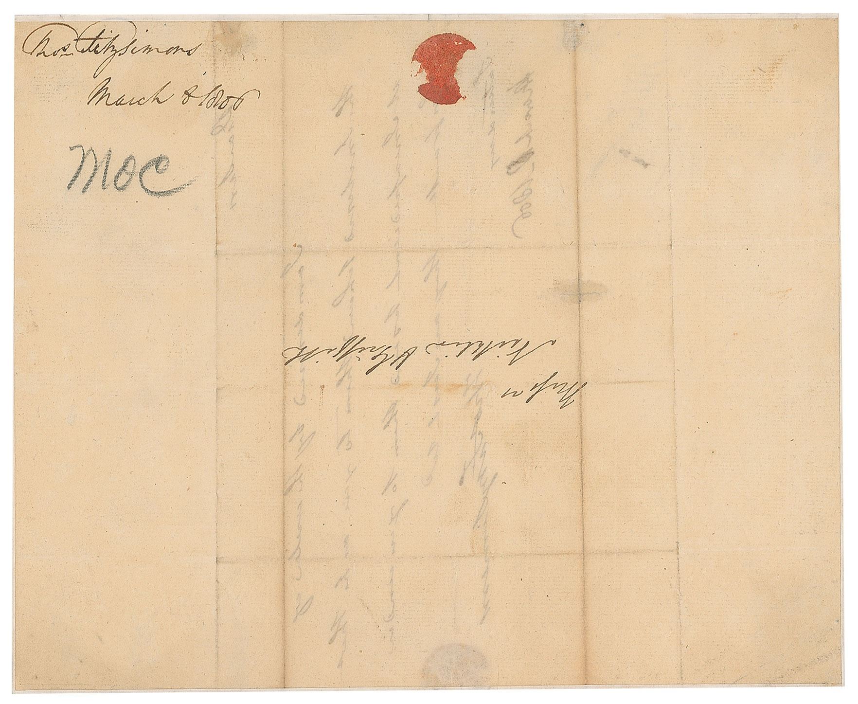 ALS signed “Thos. Fitzsimmons,” one page, 7.75 x 9.5, March 8, 1806. Brief letter to law partners Philip Nicklin and Robert Eaglesfield Griffith, in full: "I am desired by the writer of the Inclosed to hand them to you as he tho't it inexpedient to send them to you under his frank. They are just rec'd." In fine condition.