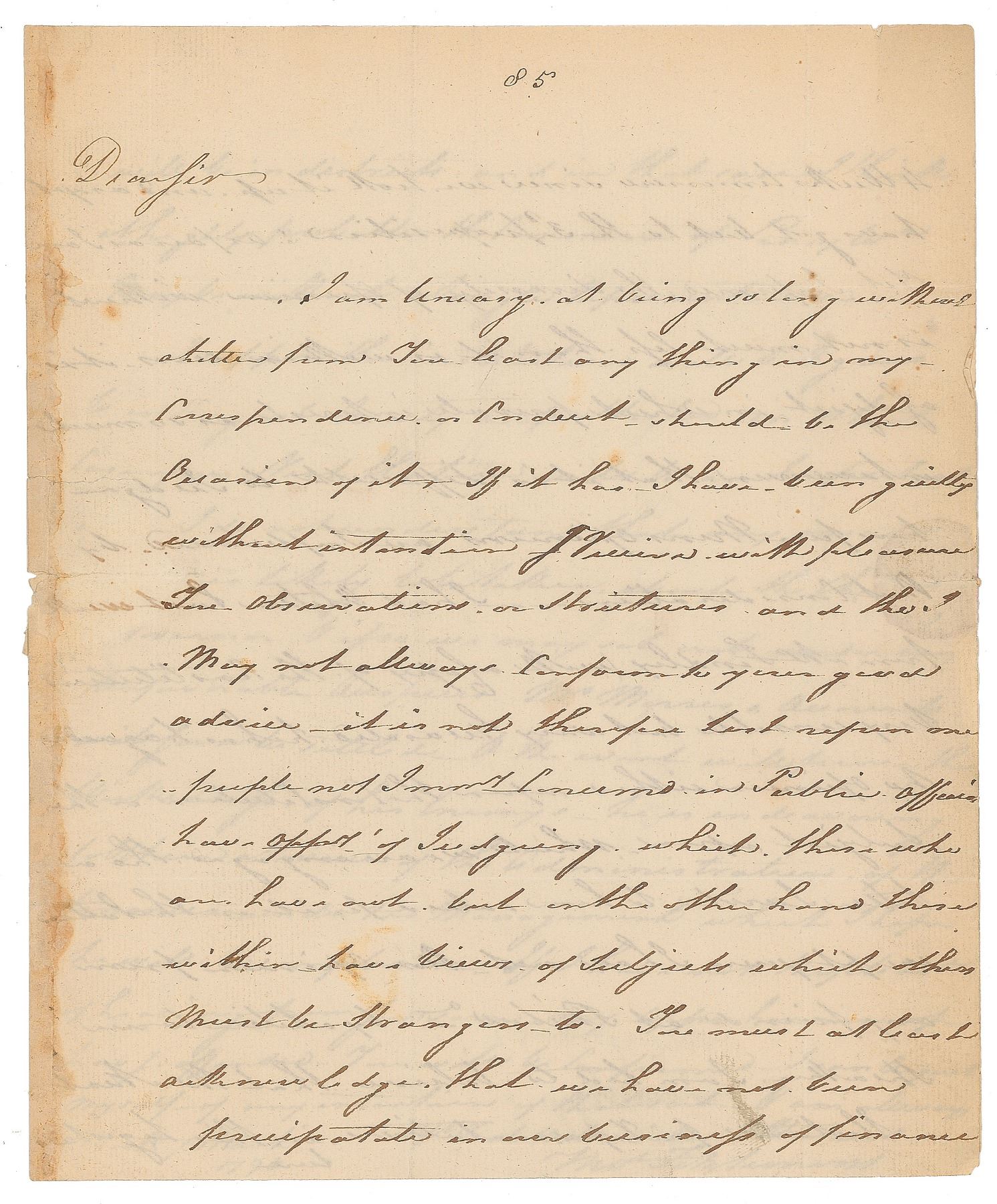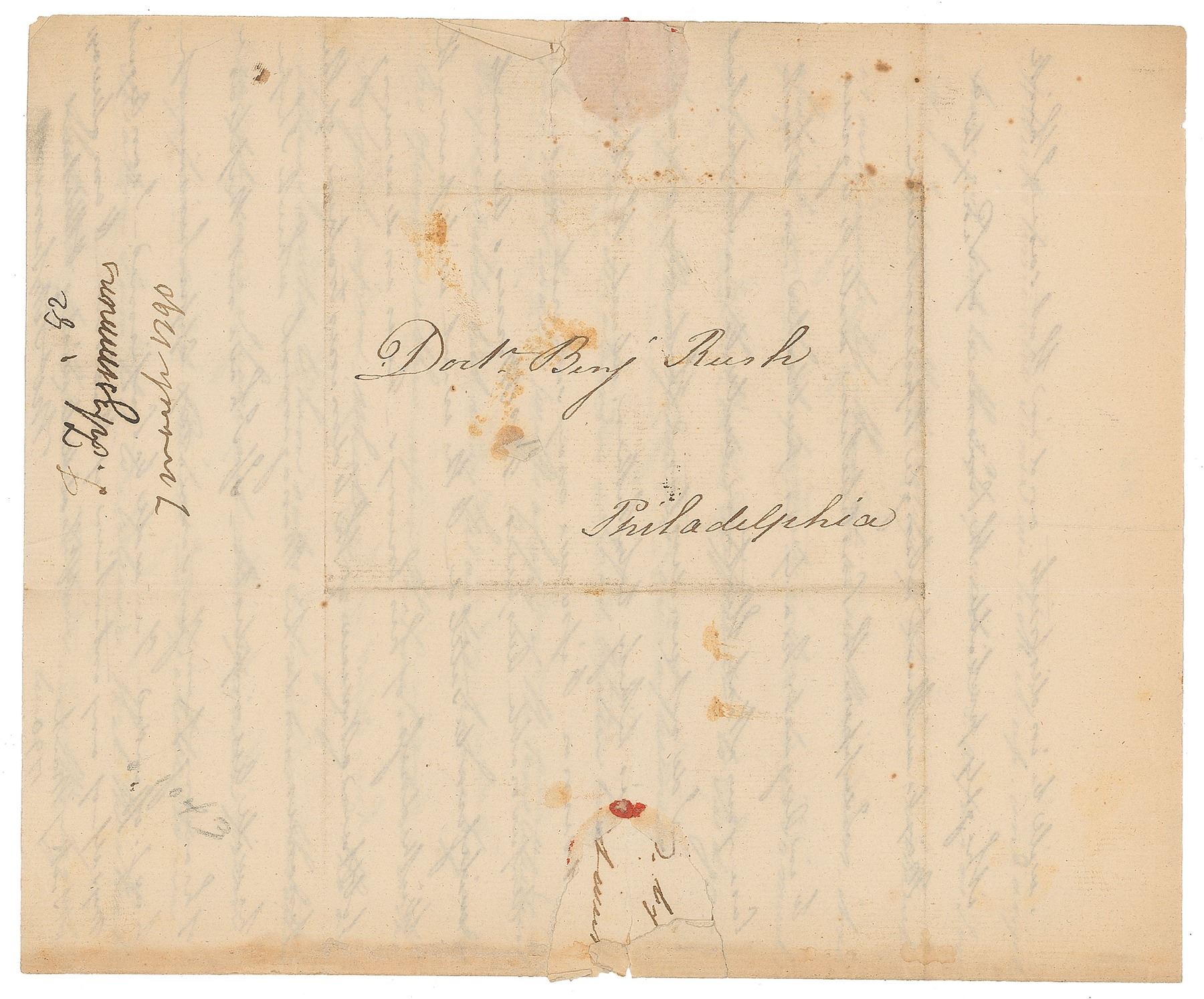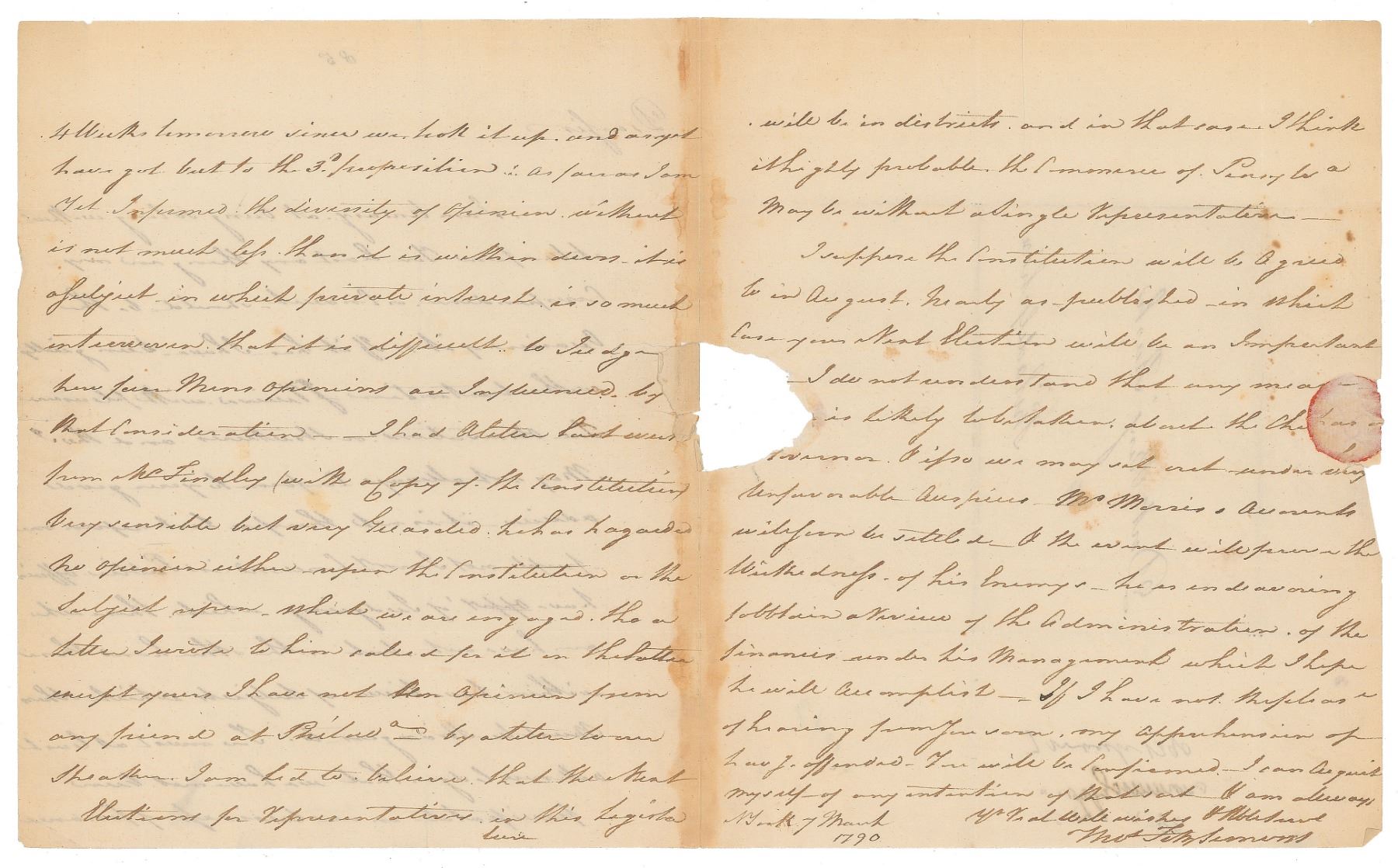 ALS signed “Thos. Fitzsimons,” three pages on two adjoining sheets, 7.25 x 8.75, March 7, 1790. Penned in his difficult-to-decipher hand, a letter to founding father and Declaration of Independence signer Benjamin Rush, in part: "I am uneasy at being so long without a letter from you least any thing in my correspondence as indecent should be the occasion of it, if it has I have been quietly without intention…I suppose the Constitution will be agreed to in August nearly as published in which case your next election will be…important." In very good to fine condition, with staining to the hinge, two tears to the left edge, and seal-related paper loss to the integral address leaf affecting some of the body of the letter.