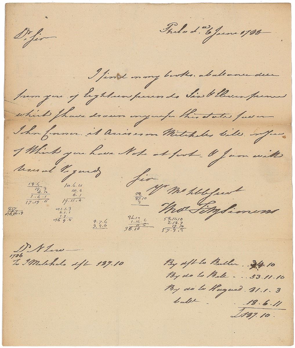 ALS signed “Thos. Fitzsimons,” one page, 7.75 x 9, June 6, 1788. Letter to Nicholas Low of New York, acknowledging a debt, in part: “I find in my books a balance due from you of eighteen pounds six and eleven pence which I have drawn myself this date.” Fitzsimons accounts the debt with numerous calculations below. Addressed on the reverse of the second integral page in Fitzsimon’s own hand. In very good to fine condition, with seal-related paper loss to reverse of second integral page.