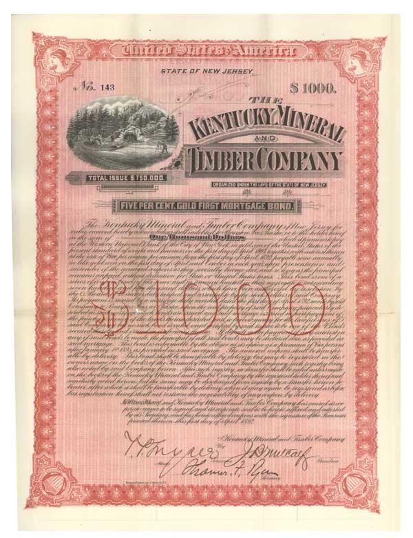 THOMAS FORTUNE RYAN. 1892, New Jersey. A $1,000 bond for the Kentucky Mineral and Timber Company bearing 5% interest for 15 years. It is signed by Thomas F. Ryan as secretary. Red borders and a red background on large white paper. Large company logo and engraving of surveyors working outside a mine entrance. Complete coupons to the right side. An outstanding example. Minor paper splits at folds else fine.