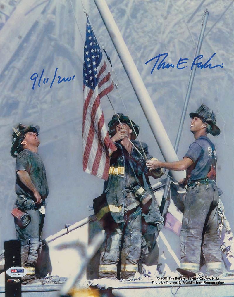American photographer best known for his photograph Raising the Flag at Ground Zero, which depicts firefighters raising the American flag at the World Trade Center after the attacks on September 11, 2001. Color glossy 11 x 14 photo, signed in blue felt tip, “9/11/2001, Thomas E. Franklin.” In very fine condition, with a PSA/DNA label affixed to the lower left corner. Accompanied by a certificate of authenticity from PSA/DNA.